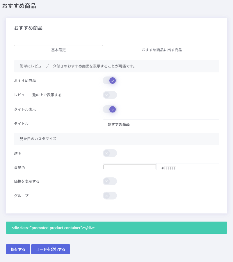 全て設定し終えたら保存し、「コードを発行する」を押して発行されたコードをウェブサイトに貼り付けることでおすすめ商品スライダーに設置できます。