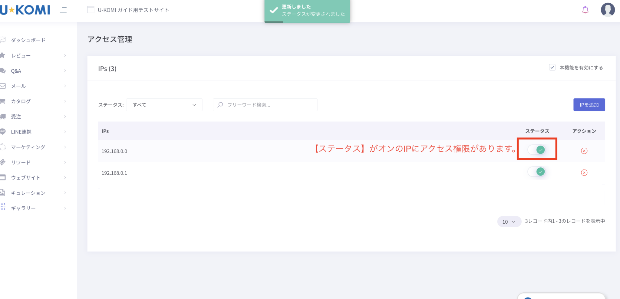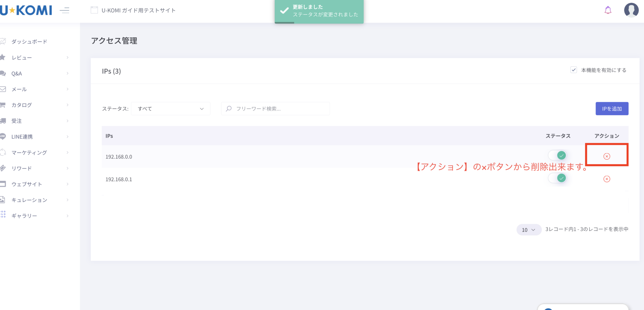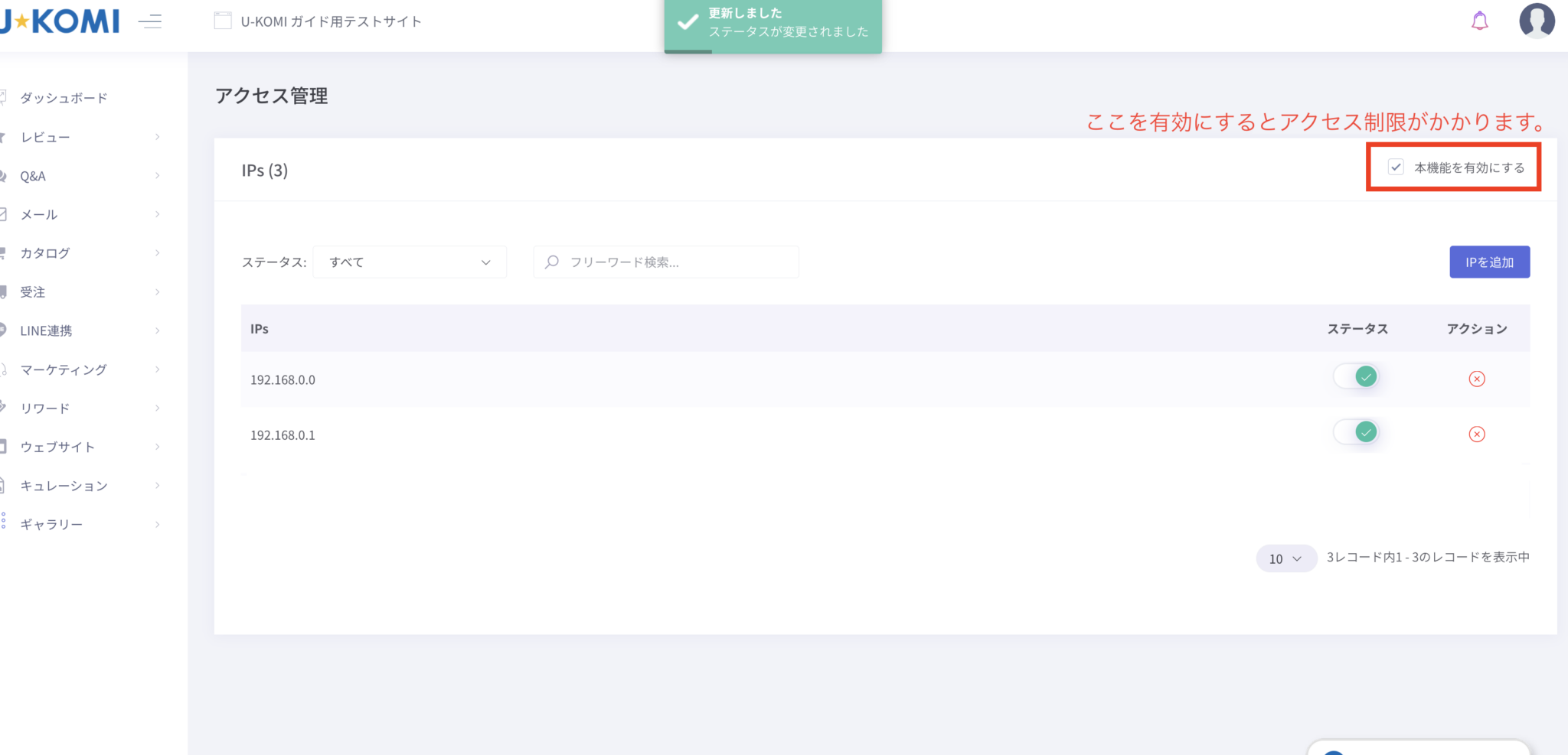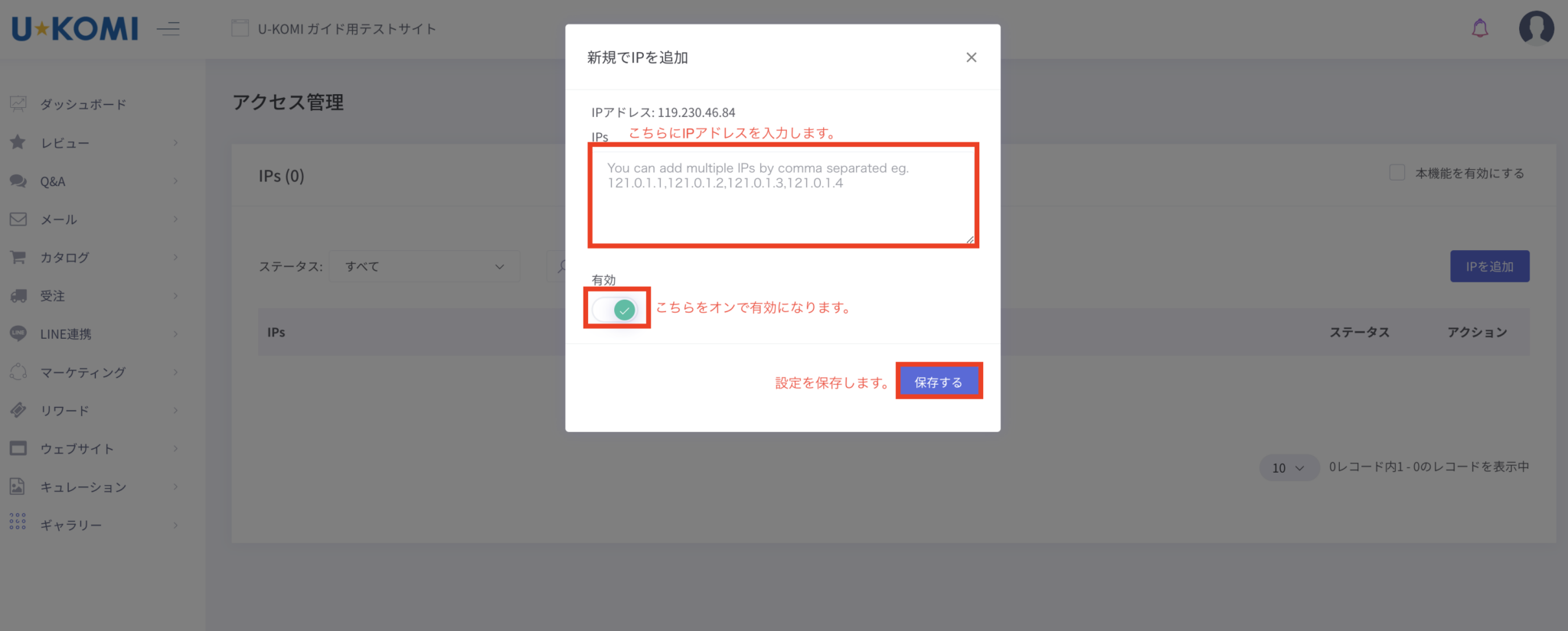 ご自身のIPアドレスをリストに追加せずにこの機能を有効にすると、U-KOMI管理画面にアクセスできなくなる恐れがあります。