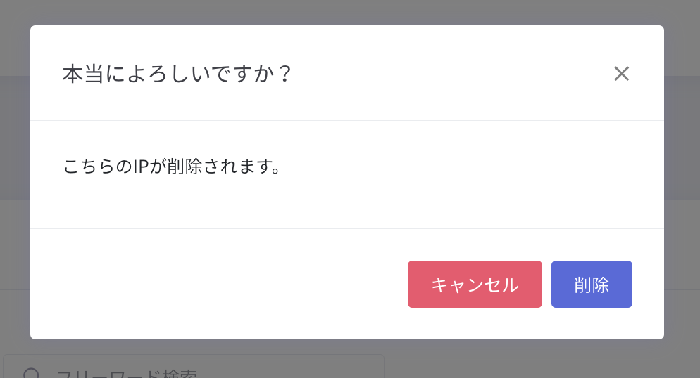 こちらの最終確認のポップアップが表示されますので、【削除】をクリックするとこの登録IPの権限は削除されます。