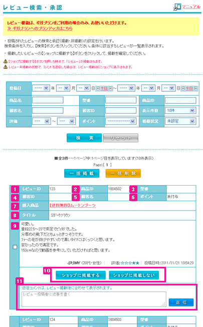 カラーミーのレビュー管理画面の画像です。