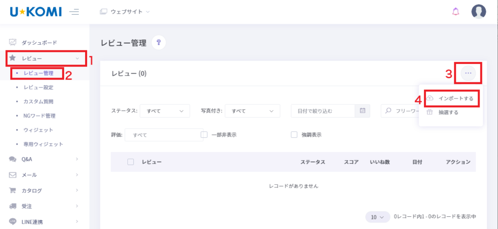 U-KOMI管理画面の[レビュー]→[レビュー管理]→[・・・のボタン]→[インポートする]をクリックします。