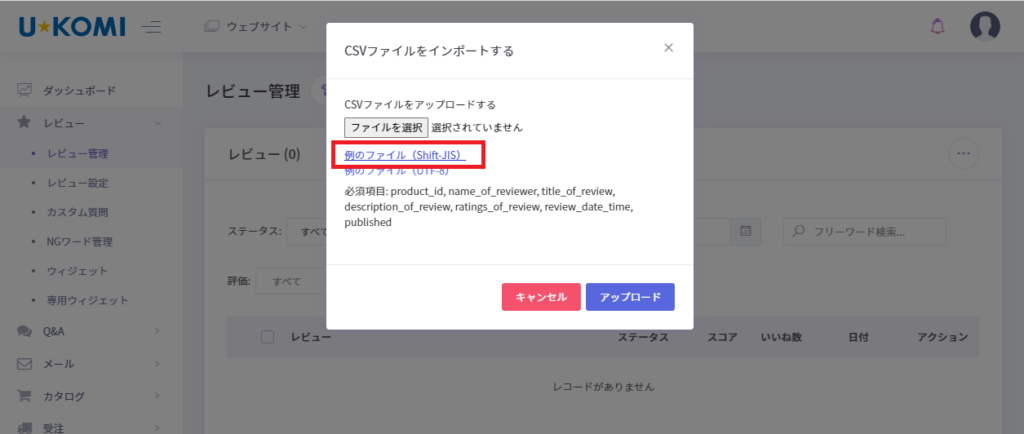 U-KOMI管理画面のレビュー管理でインポートをする時のModalです。