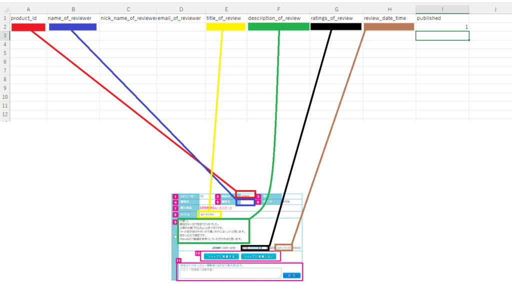 カラーミーのレビュー画面を見ながら、先程開いたU-KOMIフォーマットのファイルにコピーしていきます。(各色部分のコピーペーストとpublichedを1に設定してください。)完成したら保存してください。