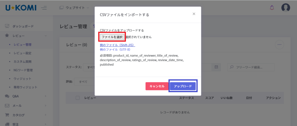 下部画像のようにウィンドウが表示されますので、赤枠の「ファイルを選択」をクリックして先程作成したファイルを選択し、青枠の「アップロード」をクリックするとレビューデータの取り込みは完了です。