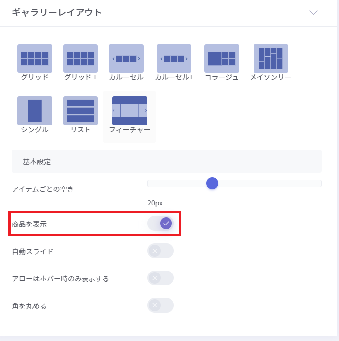 「フィーチャー」は「商品を表示」のオプションを有効にすることで、最初から商品タグを追加している商品情報を表示することが可能です。