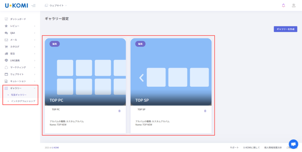 カスタムアルバムか商品アルバムを選択してギャラリーを作れます。(ギャラリーはサイト上に表示させる写真一覧のもの)