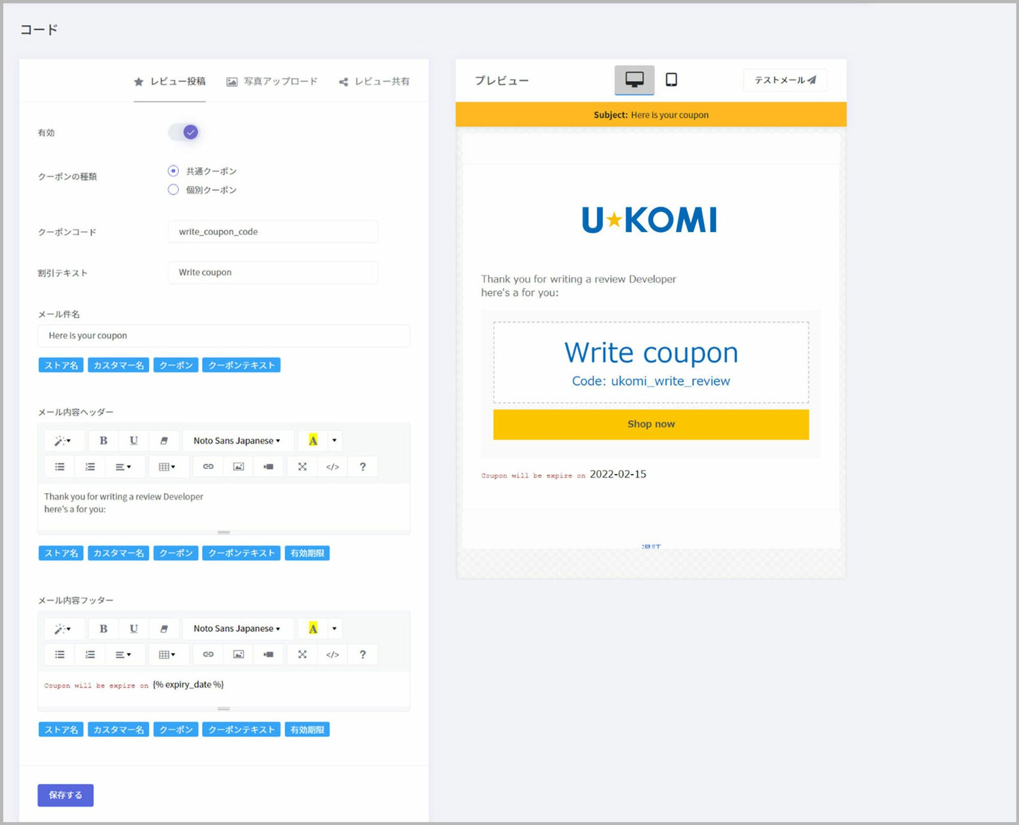 上記レビュー依頼メール内に入れるクーポンテキスト(キャッチフレーズ)を設定できます。