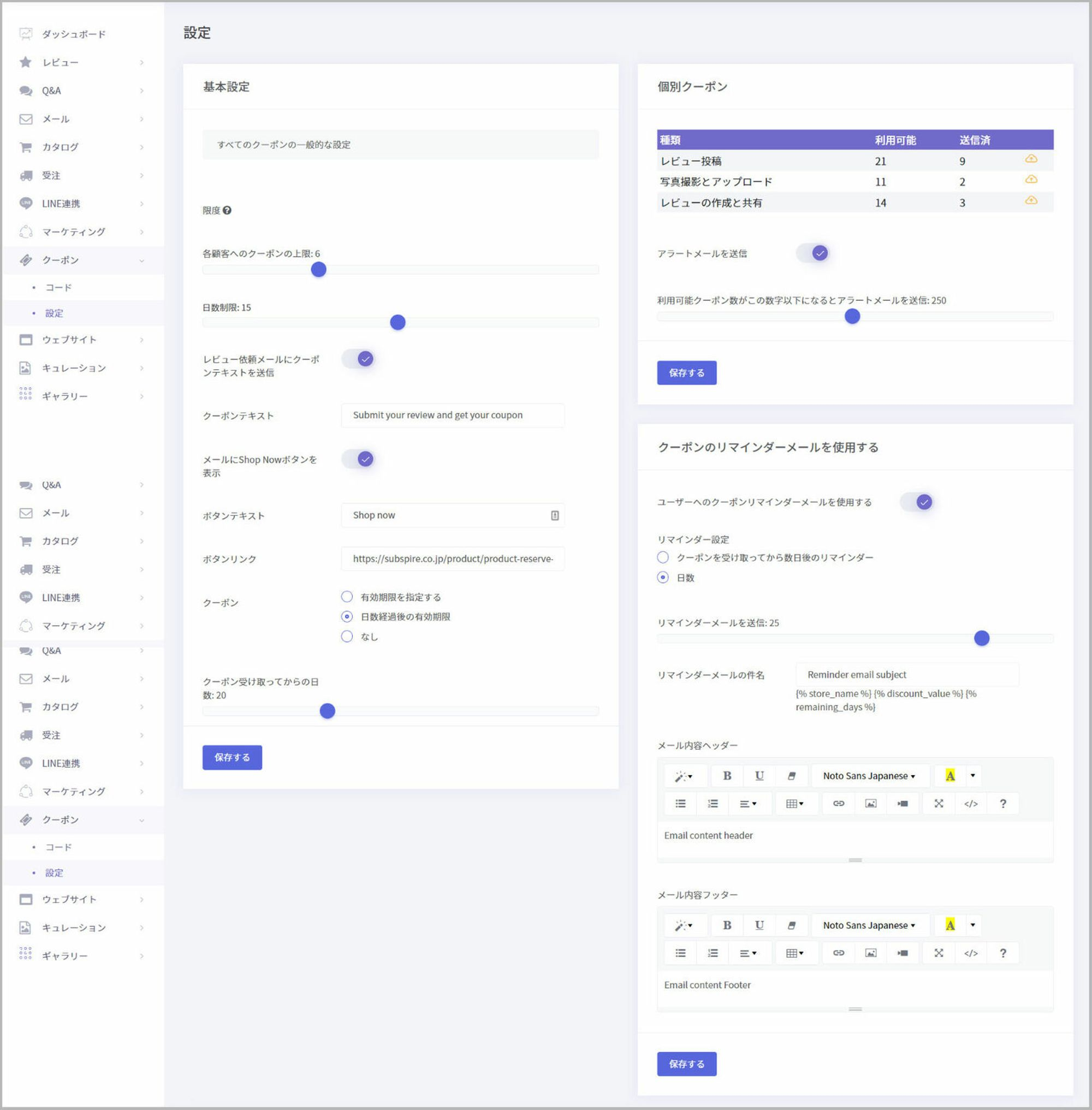この画面では「基本設定、クーポンの設定、クーポンのリマインダーメールの設定」を行うことが出来ます。