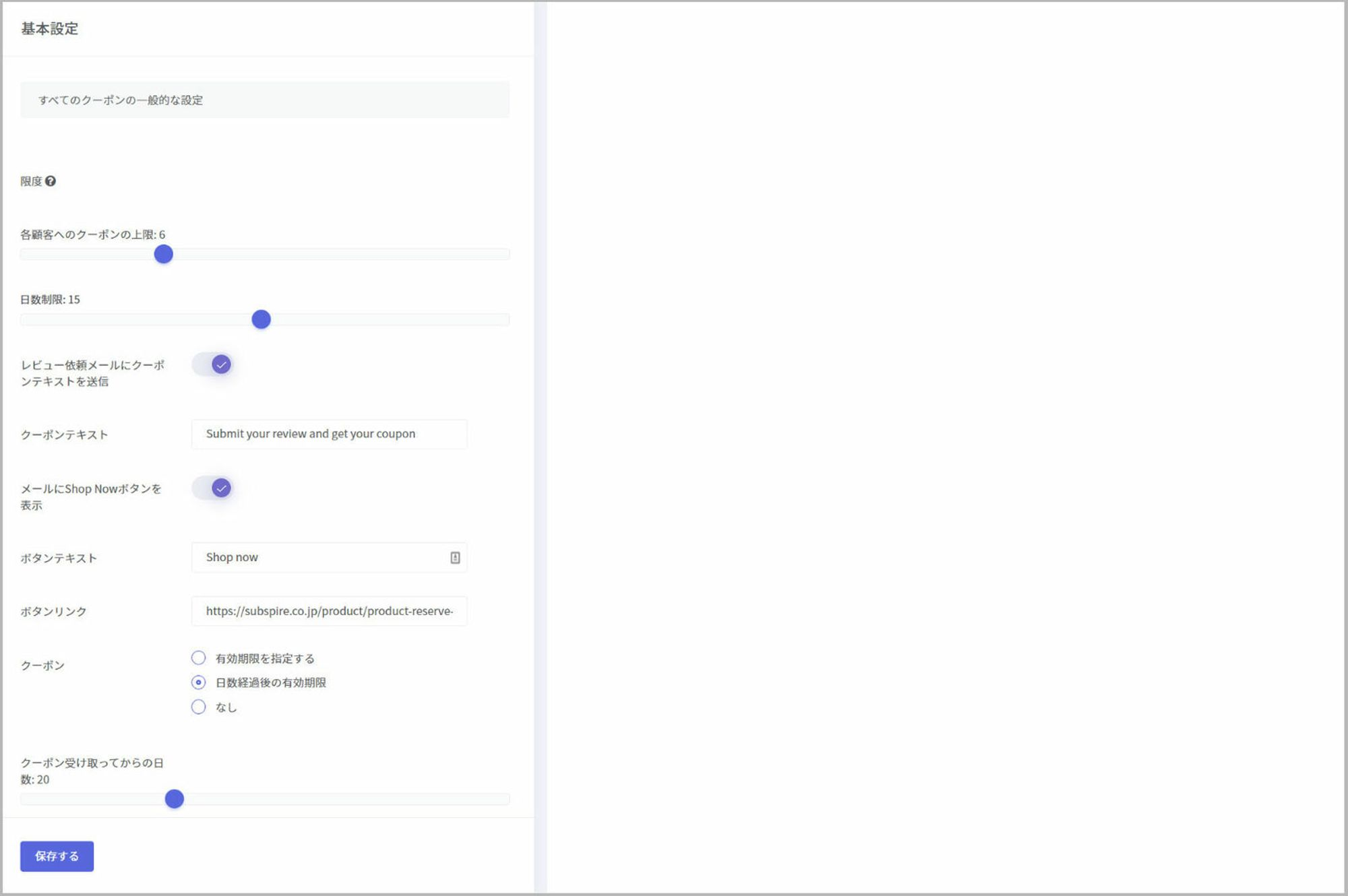 基本設定ではすべてのクーポンの一般設定を行えます。