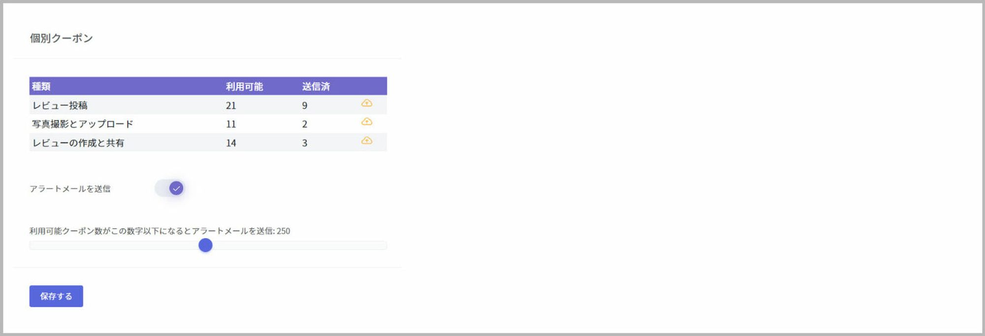 ・利用可能クーポン数がこの数字以下になるとアラートメールを送信