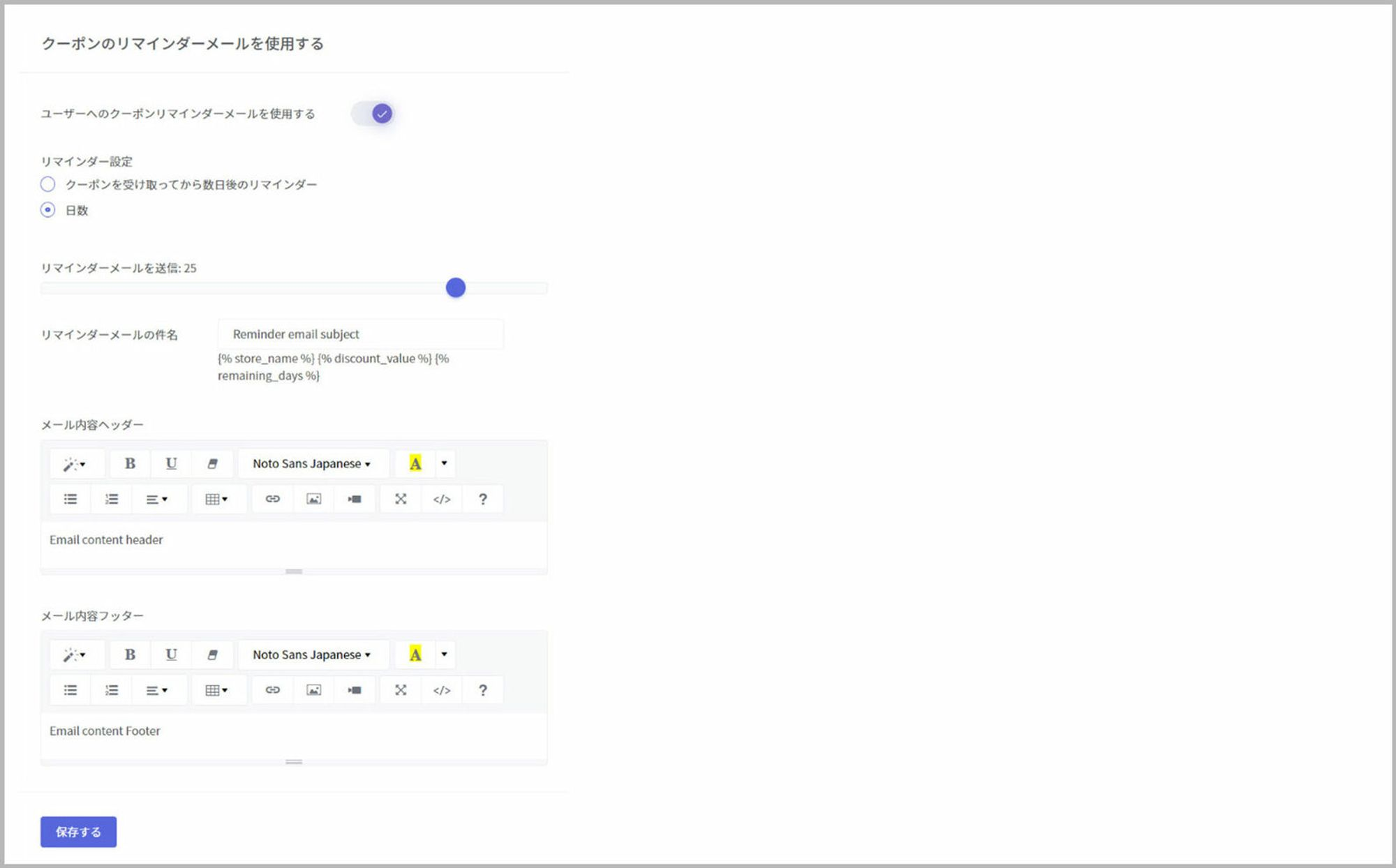 ユーザー側に対してクーポンのリマインダーメールを送信することができます。 また、このリマインダーメール機能を使用する場合は詳細設定を行います。