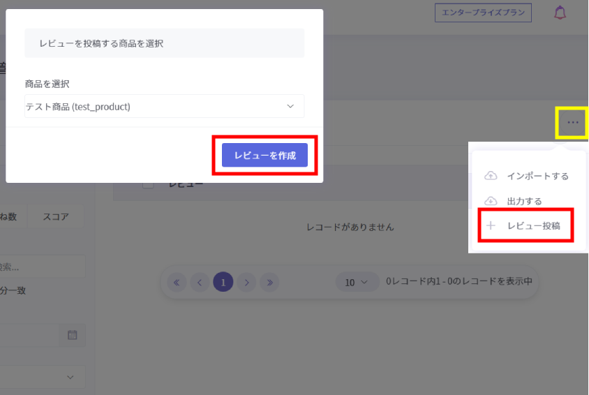 1)管理画面右上のアクションボタンから「レビュー投稿」をクリック