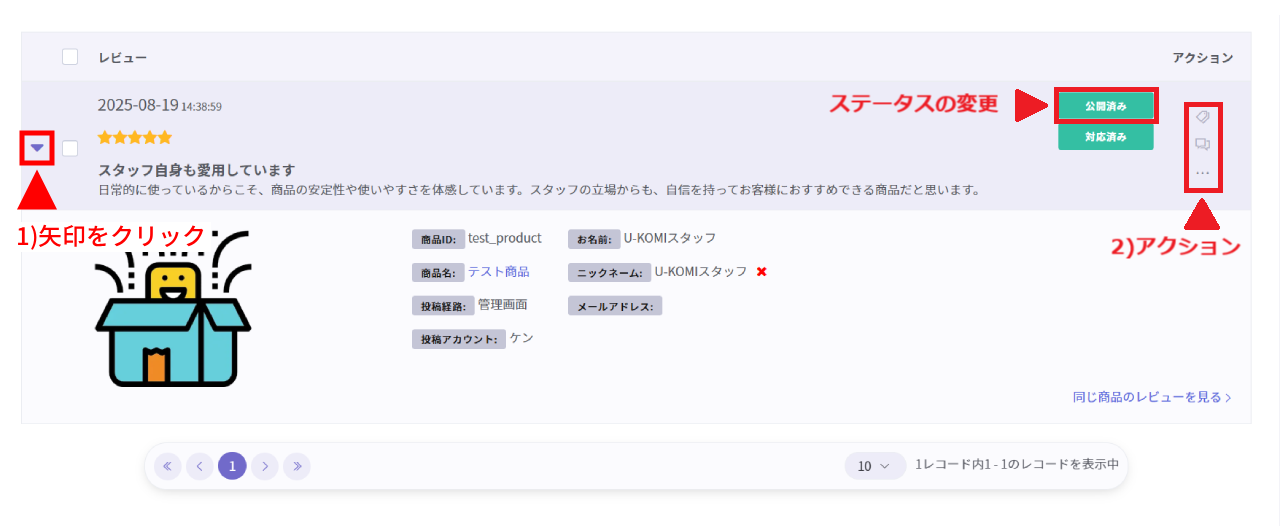 ステータス項目にある画像赤枠部分をクリックするとレビュー公開ステータスの変更ができます。