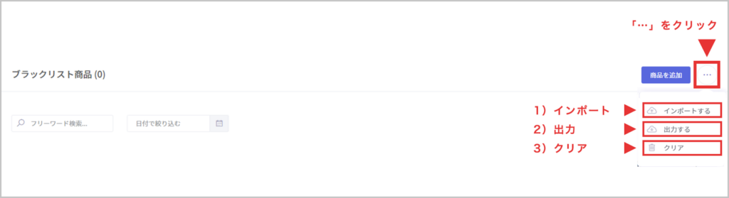 画面右上にある「・・・」を押し【インポート】でブラックリスト商品をインポートできます。