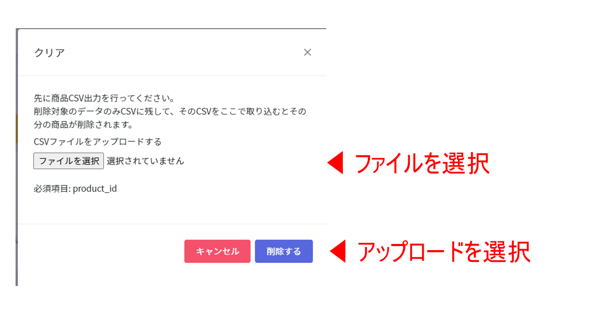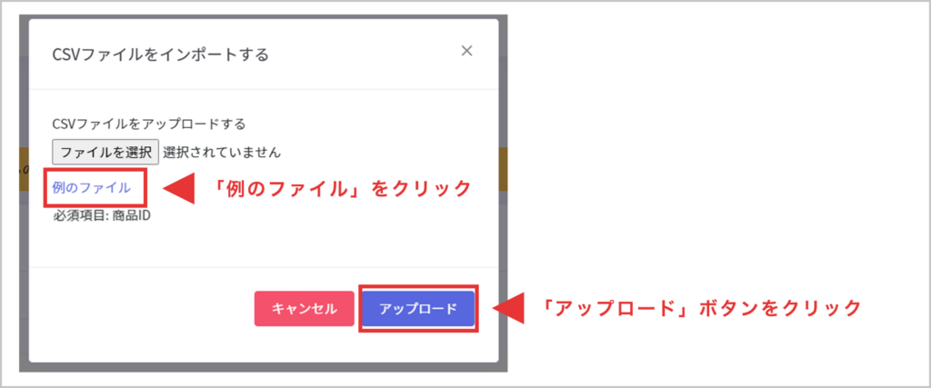 インポート用ファイルに保存できましたらファイル選択でファイルをアップロードしていただき、【アップロード】ボタンで処理を行ってください。