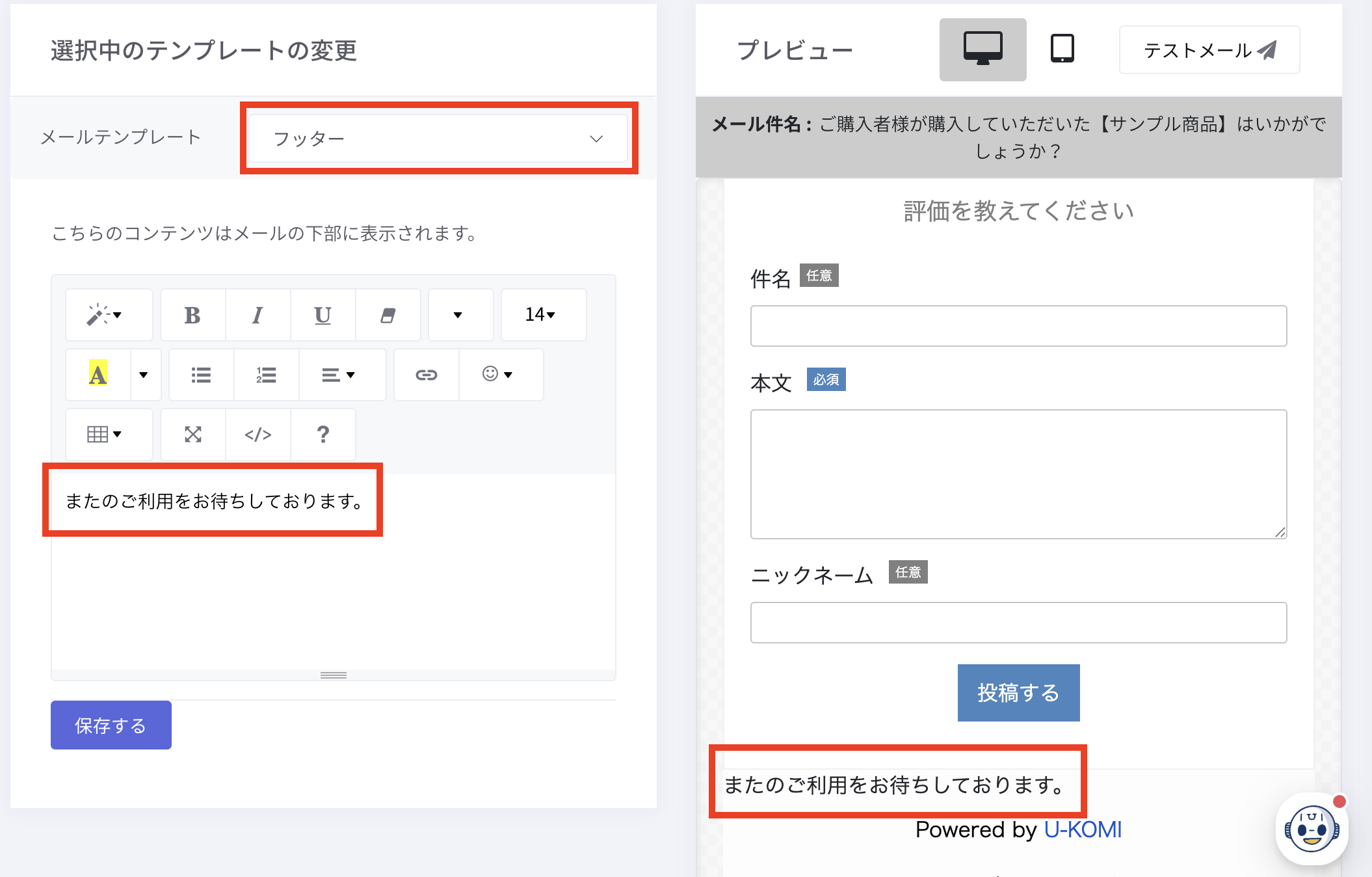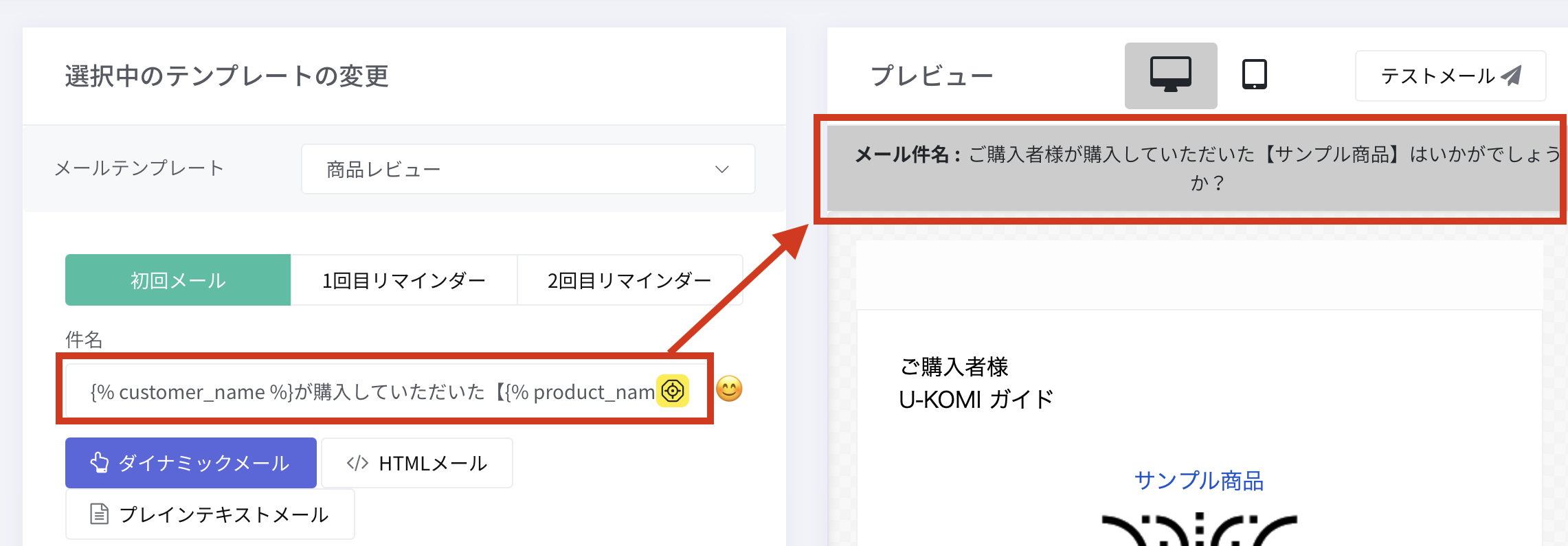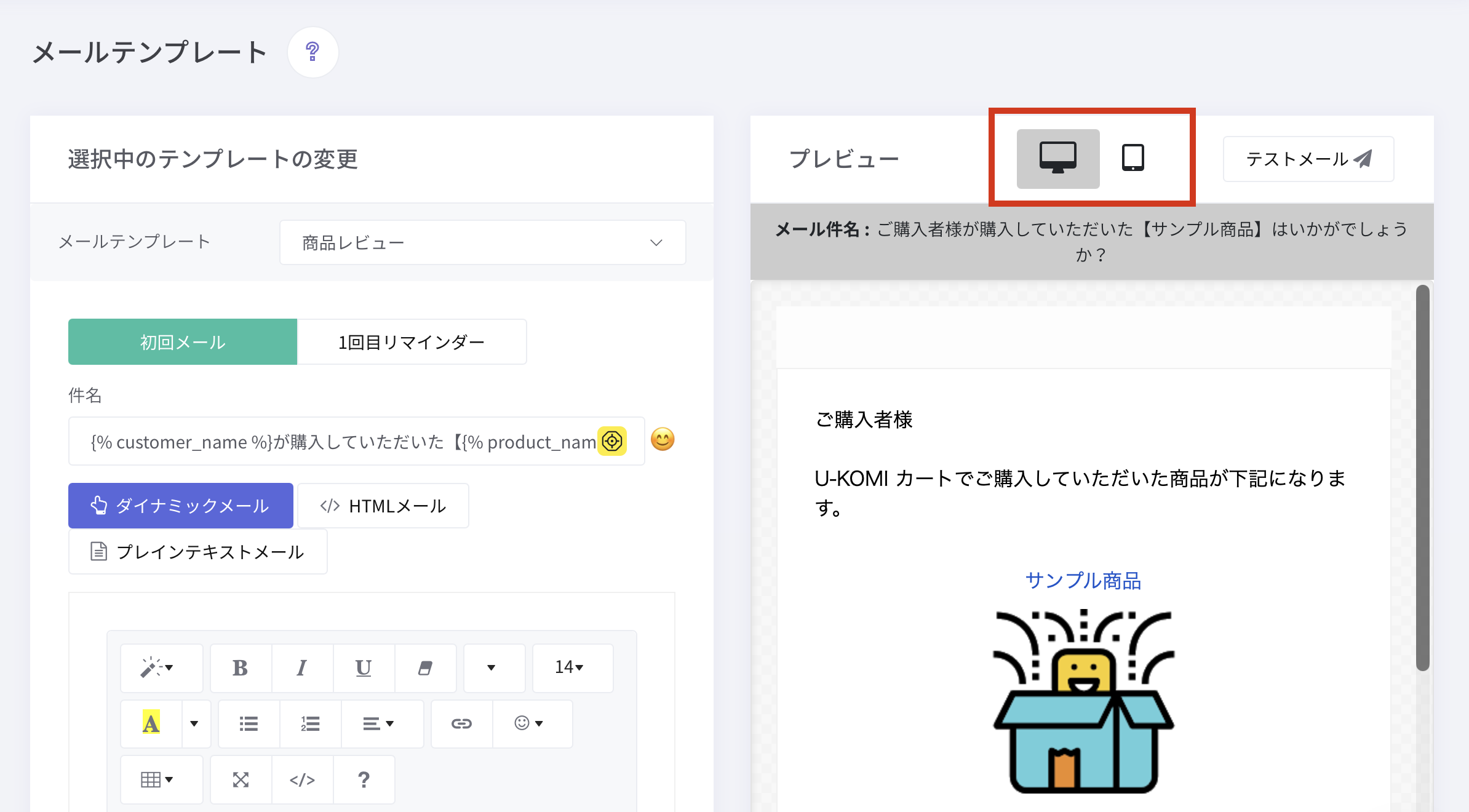 ② プレビュー画面の右上側に表示されている「テストメール」をクリックし、商品レビューの場合は商品を検索・送信先のメールアドレスを入力し、紙飛行機マークを押します。