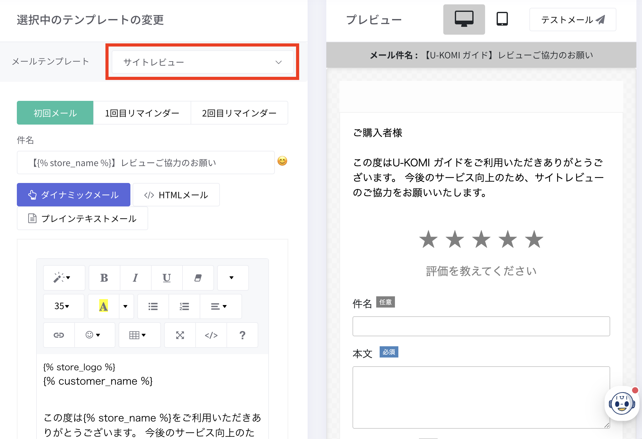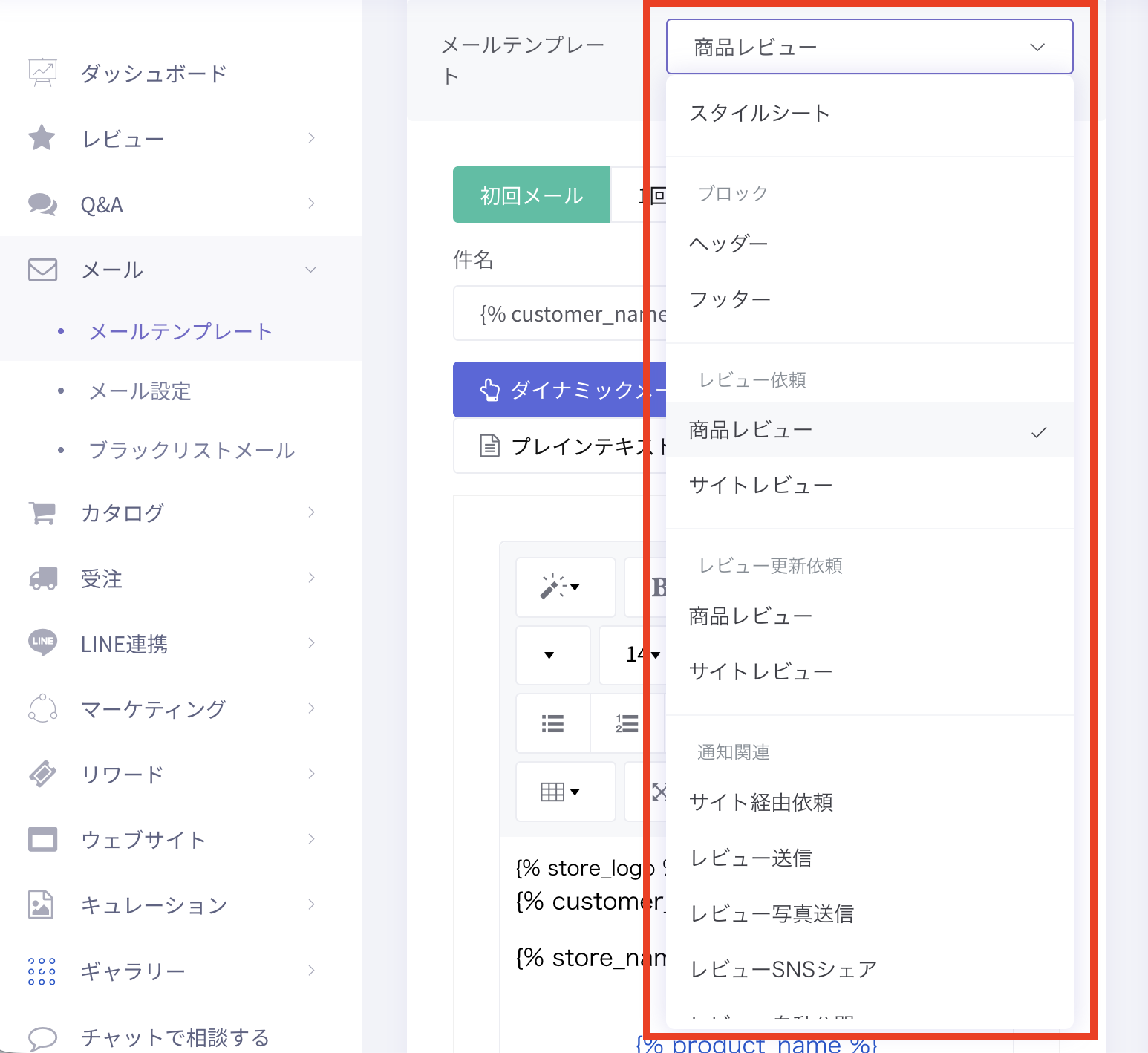 レビュー依頼メールの商品レビューと、サイトレビューの設定ができます。