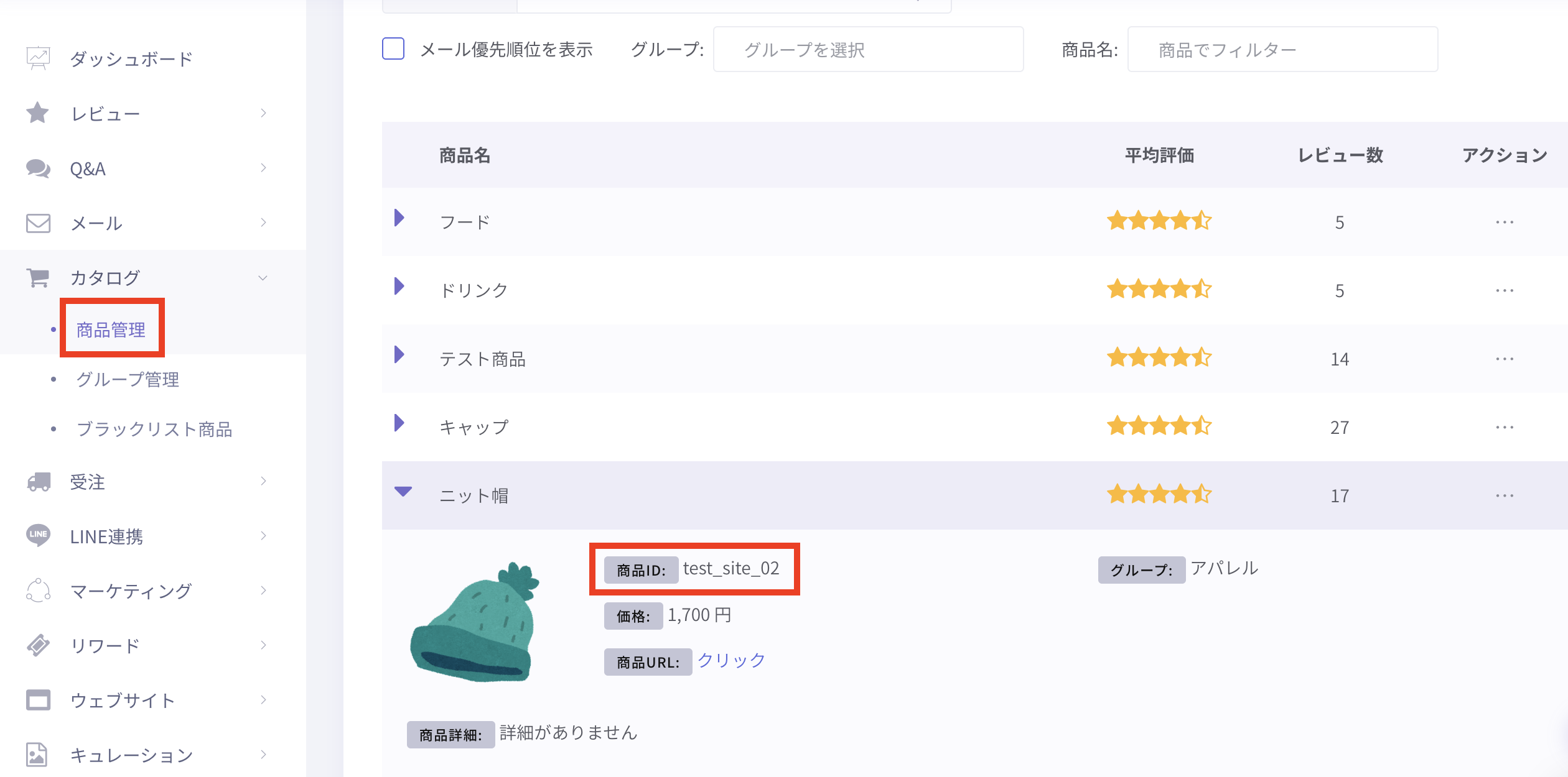 PRODUCT_ID 部分には「 カタログ > 商品管理 」より確認できる 商品ID を入力してください。