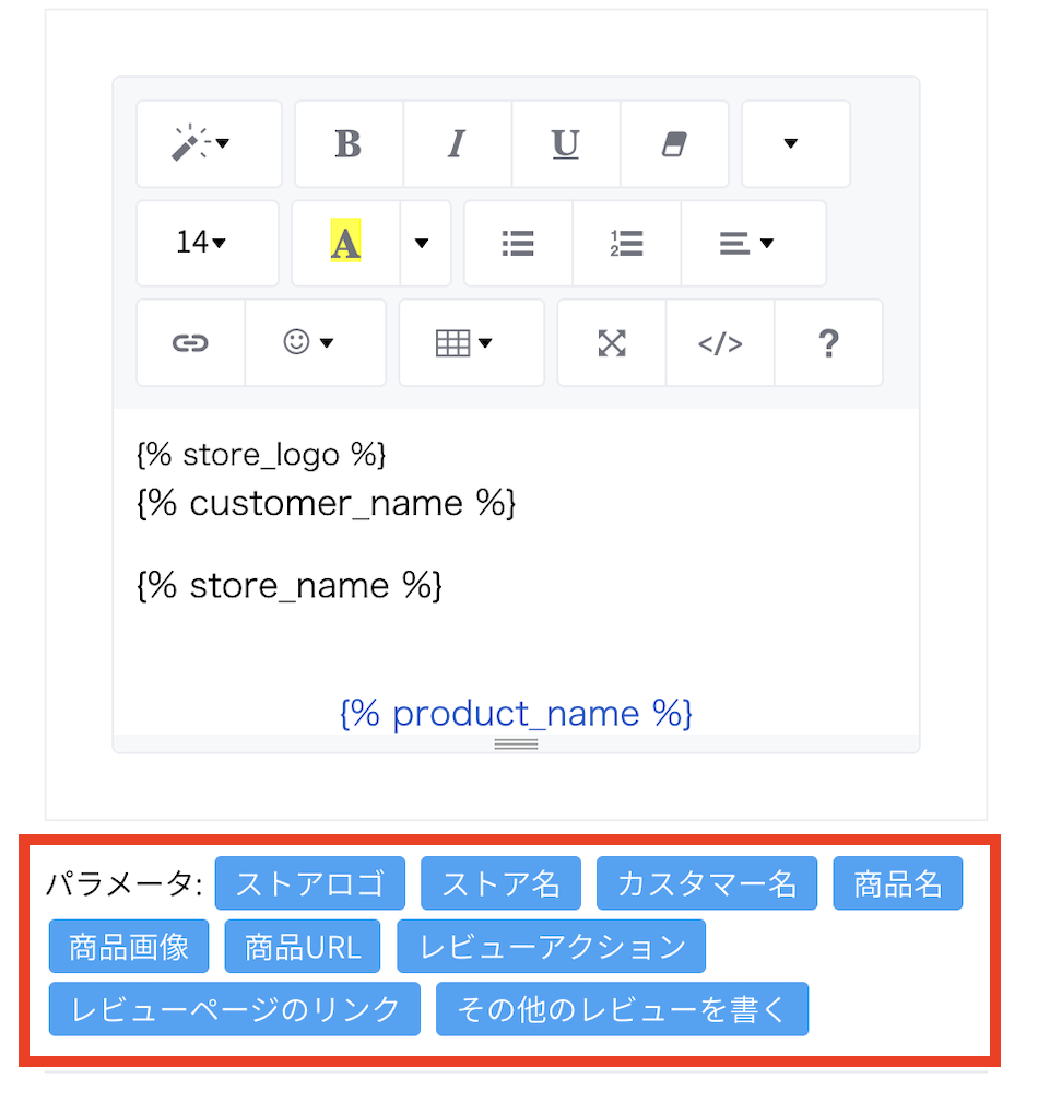 テンプレート変更画面下部にあるパラメータを、本文欄の表示したい場所にカーソルを置いた状態でクリックすることで簡単にタグが入力されます。
