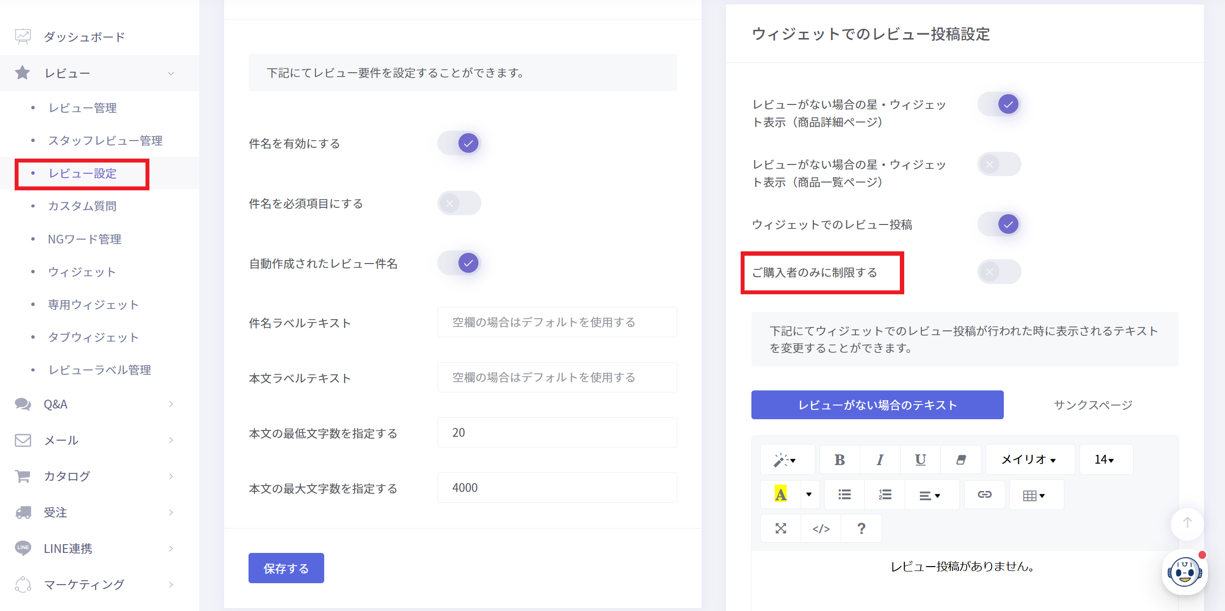 「レビュー設定 > ウィジェットでのレビュー投稿設定 > ご購入者のみに制限する」から、