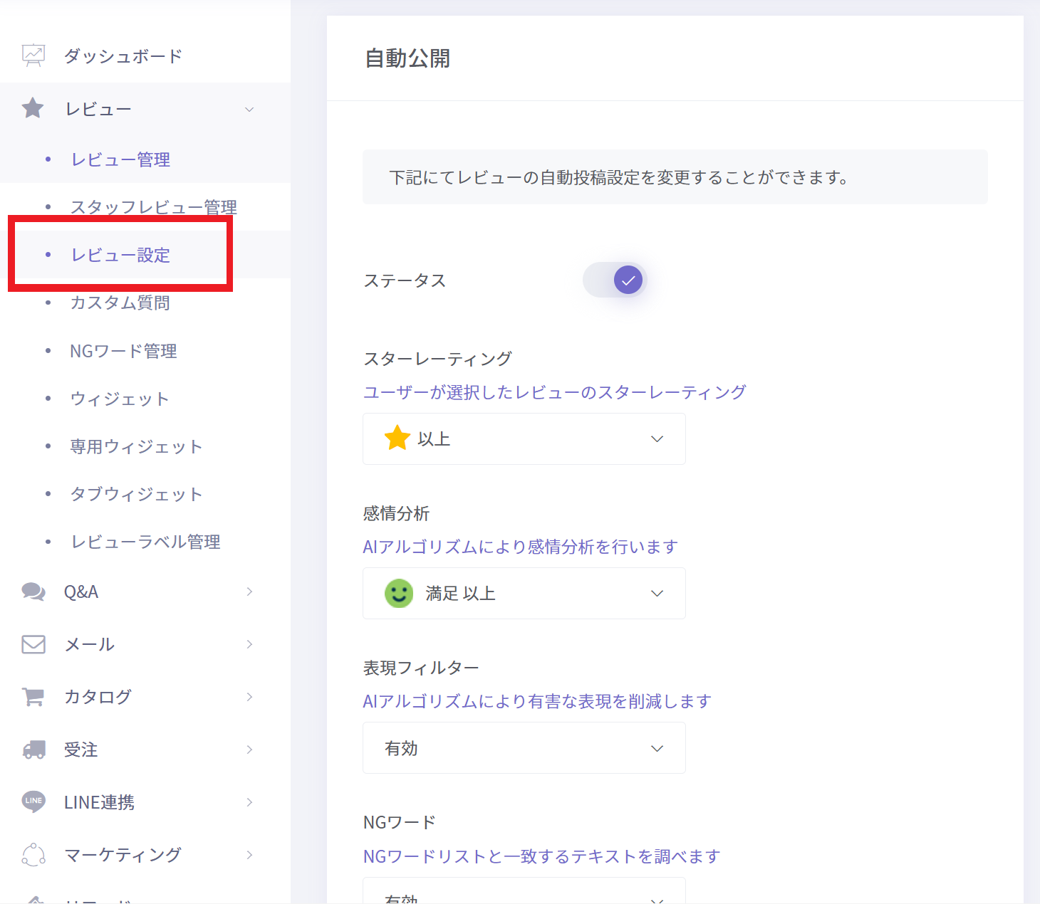 自動公開の条件は「レビュー設定 > 自動公開」のステータスより設定できます。