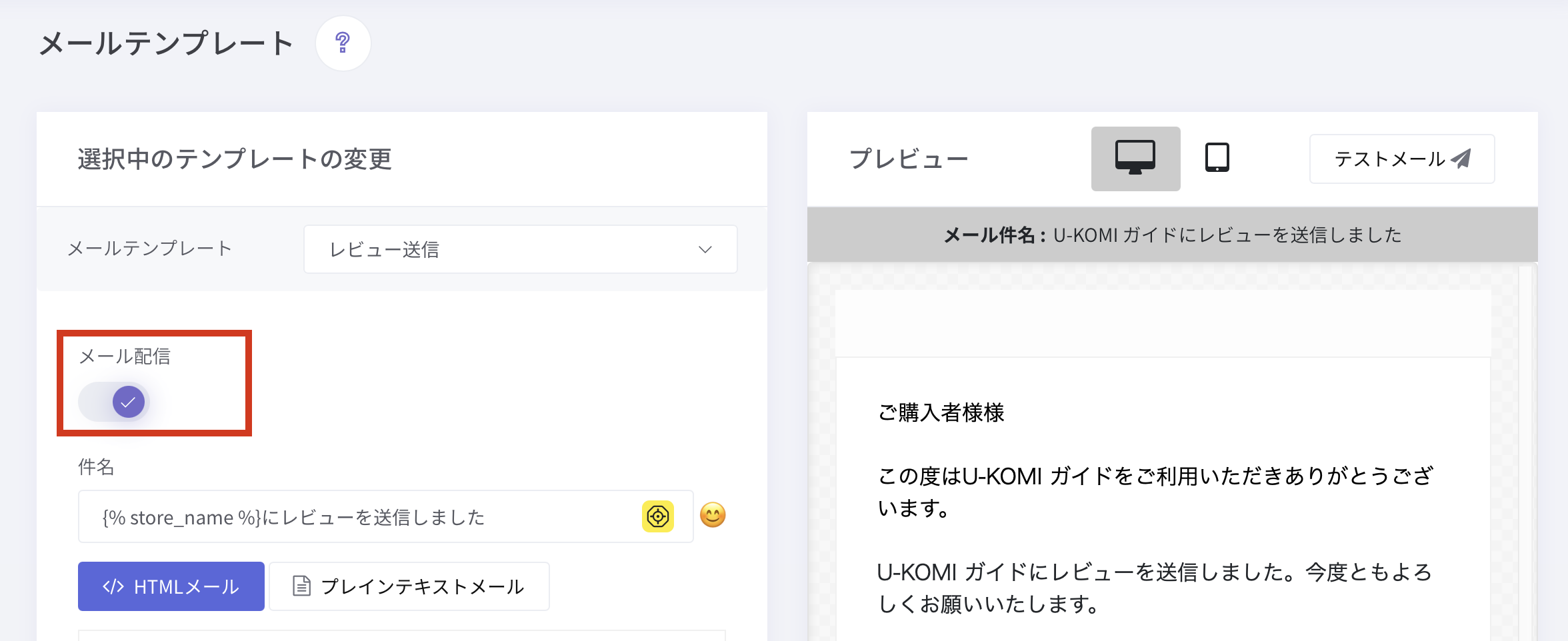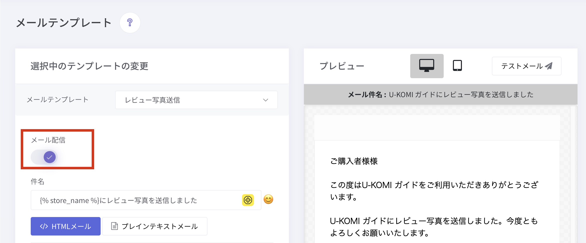 レビュー写真送信メールのメールテンプレートを選択し、メール配信より有効 / 無効を設定できます。