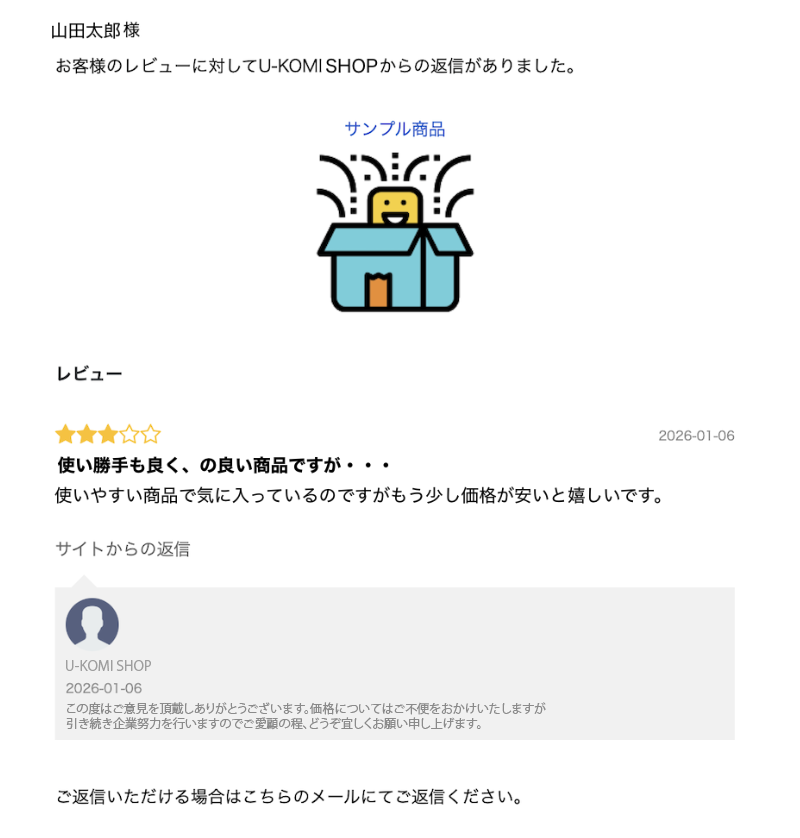 レビュー管理で「レビュー返信」を行った時に配信されるメールです。