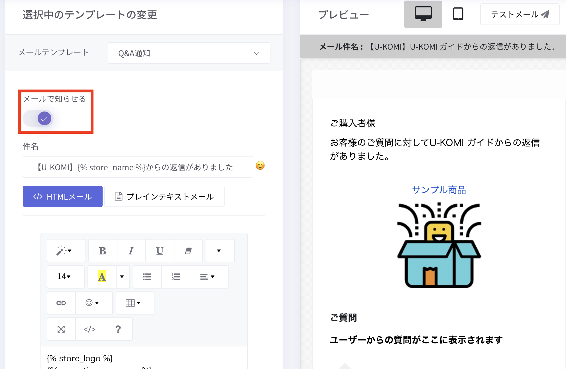 Q&A返信画面の「メールで知らせる」欄がデフォルトで有効になります。