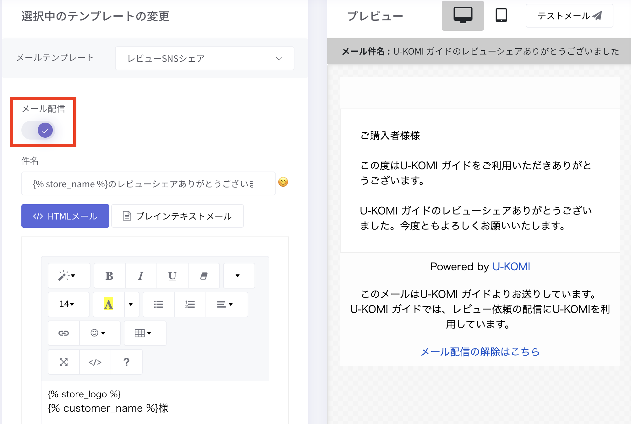 レビューSNSシェア のメールテンプレートを選択し、メール配信を 有効 にすると、SNSシェア後に送信されます。