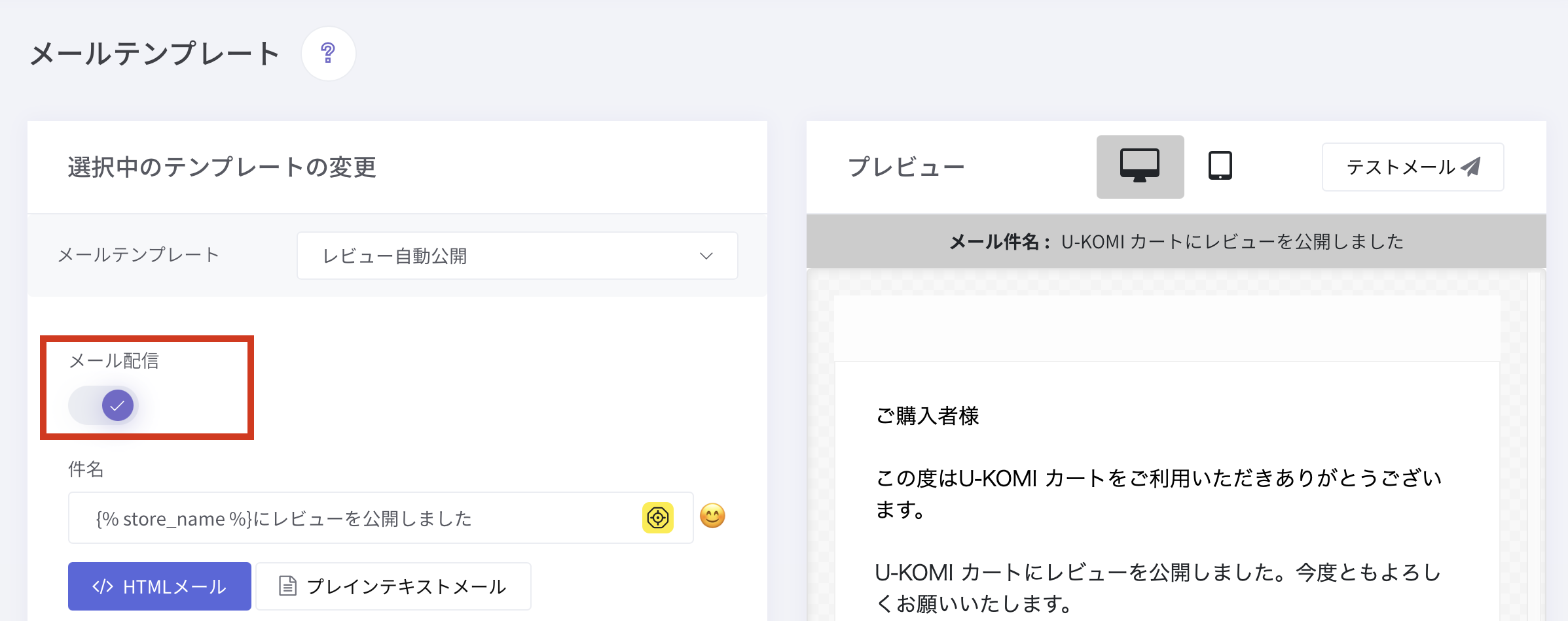 メール配信設定は「メール > メールテンプレート > レビュー自動公開」のメール配信で設定できます。