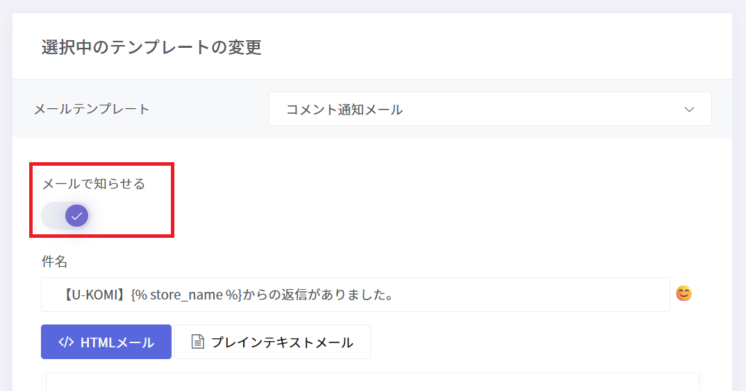 「メール > メールテンプレート > コメント通知メール 」の「メールで知らせる」では、