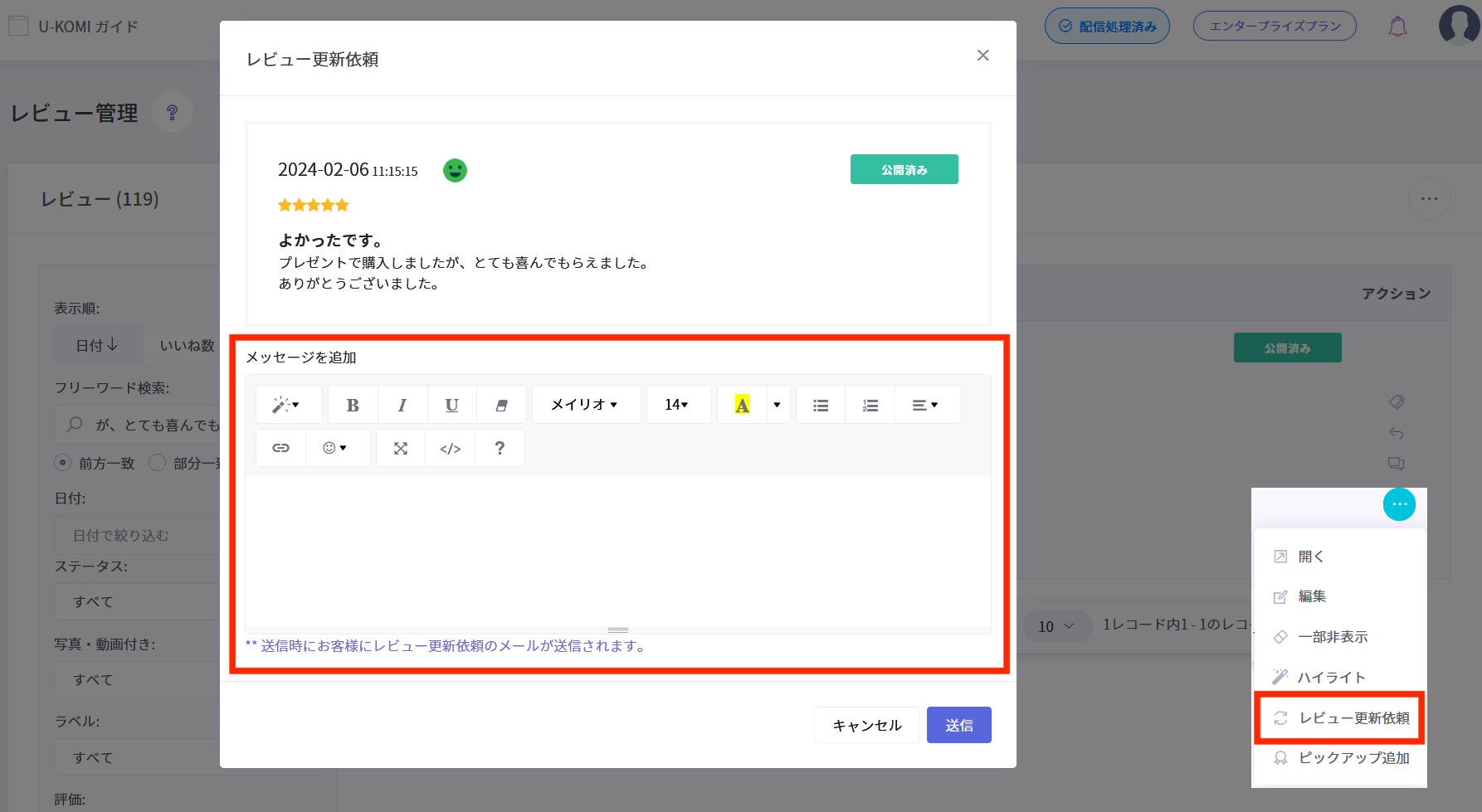 実際にレビュー更新依頼にメッセージを追加する場合は