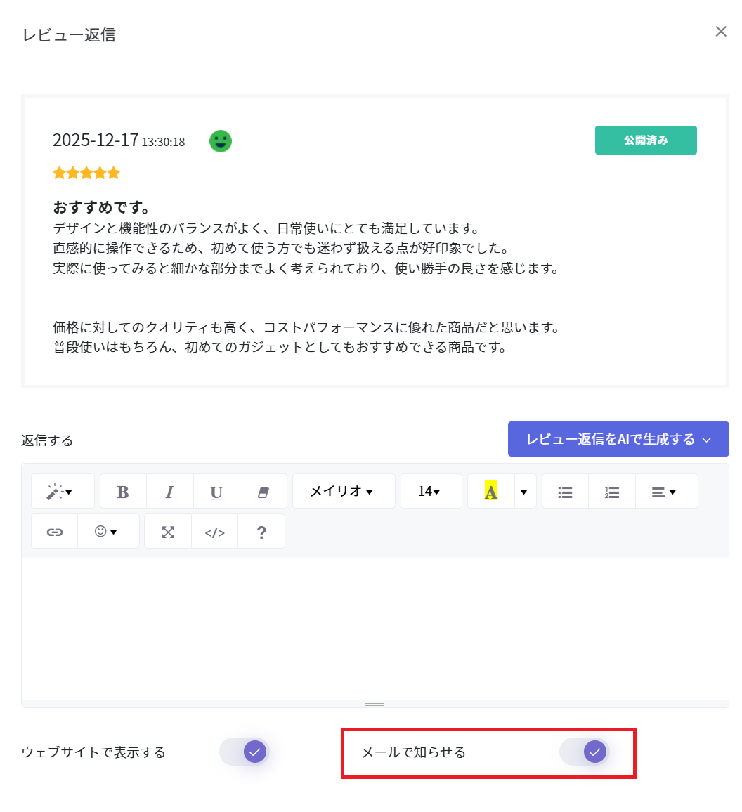 レビュー返信画面の「メールで知らせる」欄がデフォルトで有効になります。