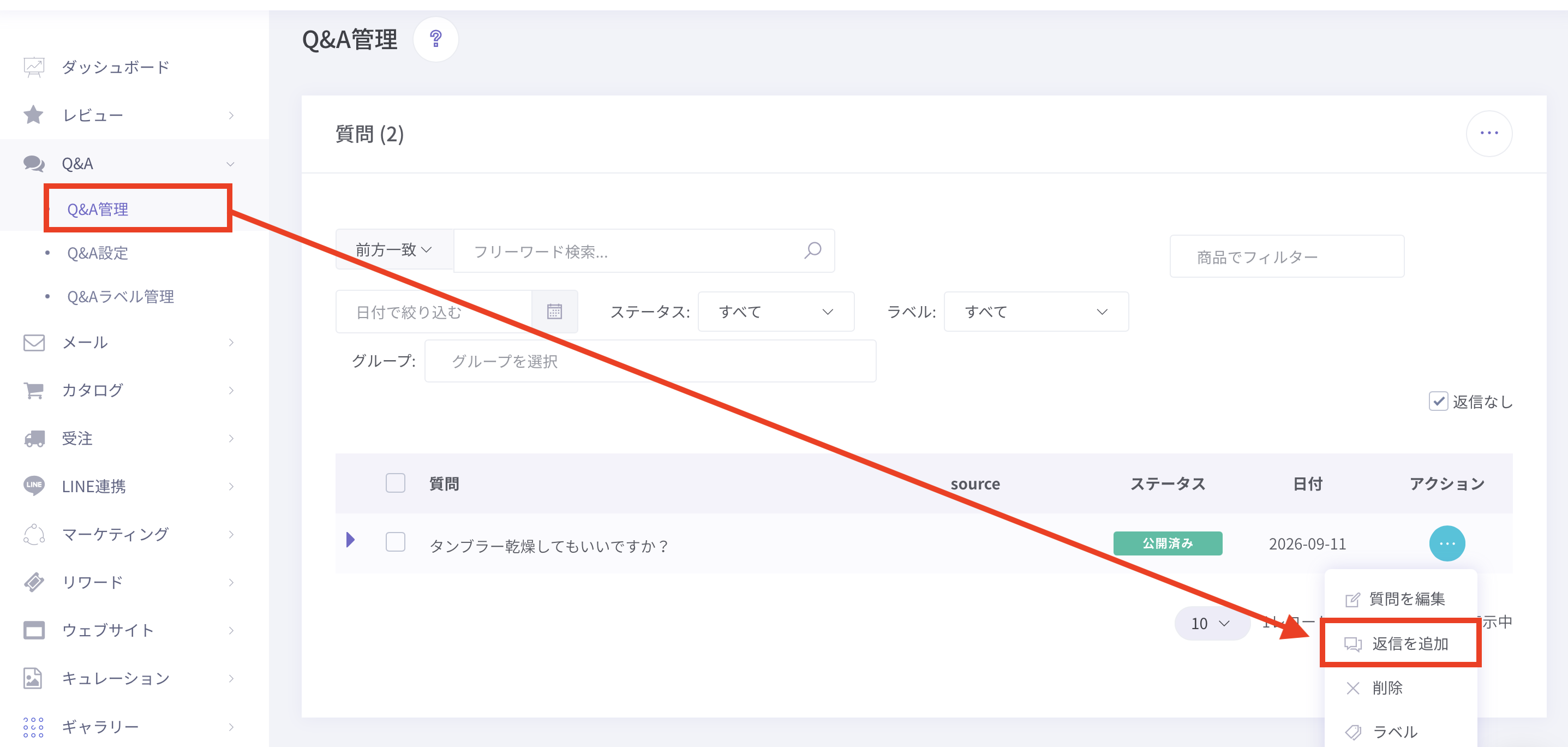 「Q&A管理 > アクションボタン(…) > 返信を追加 」より、お客様からの質問に返信した際の返信通知メールのレイアウトを設定できます。