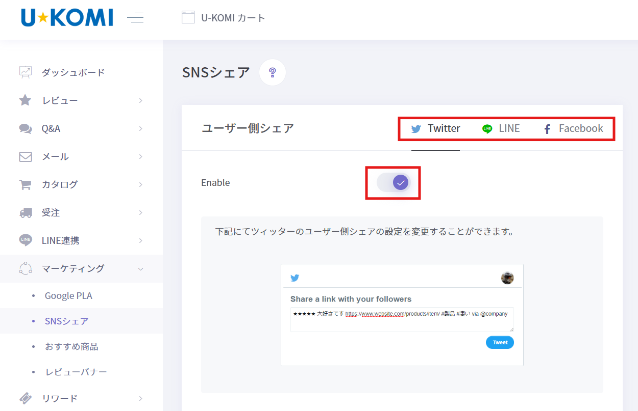 「マーケティング > SNSシェア 」より、シェア機能を有効にしたいSNS(Twitter、LINE、Facebook)を選び、Enable を 有効/無効 にすることで設定できます。