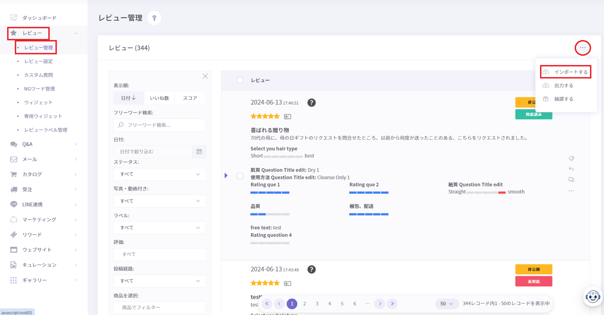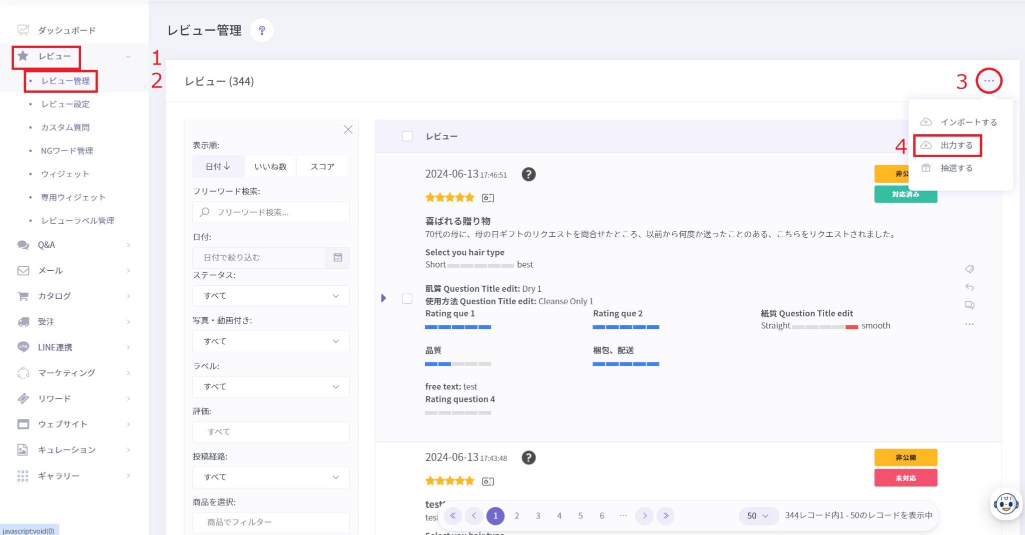 ・メモ (レビューに対してのメモを追加出来ます。※お客様には見えないので管理者同士で使用できます)