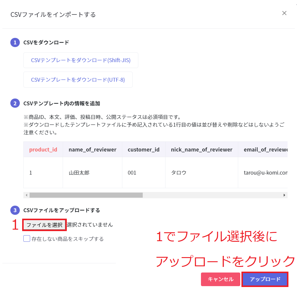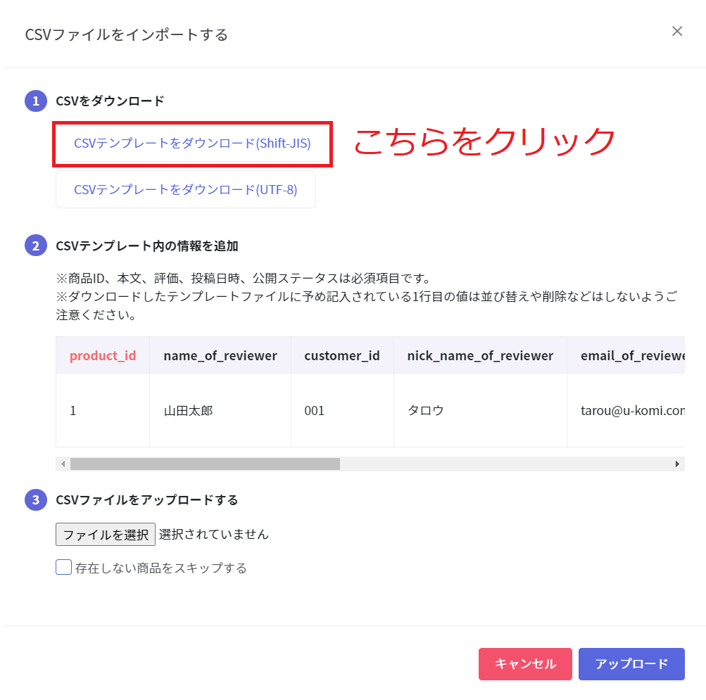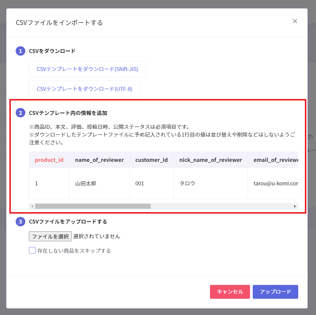 CSVテンプレート内の情報を追加のガイド画像1