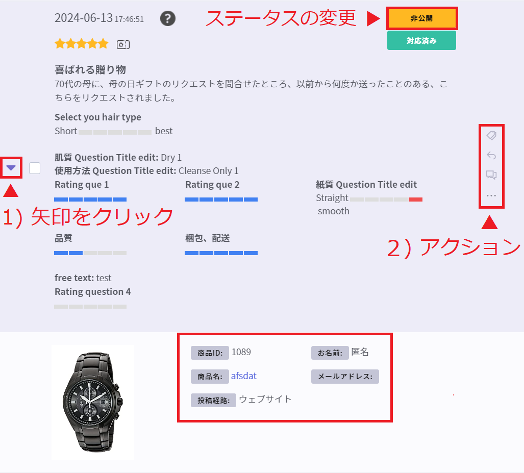 1)レビューの詳細情報(商品情報 / レビュー投稿者情報)