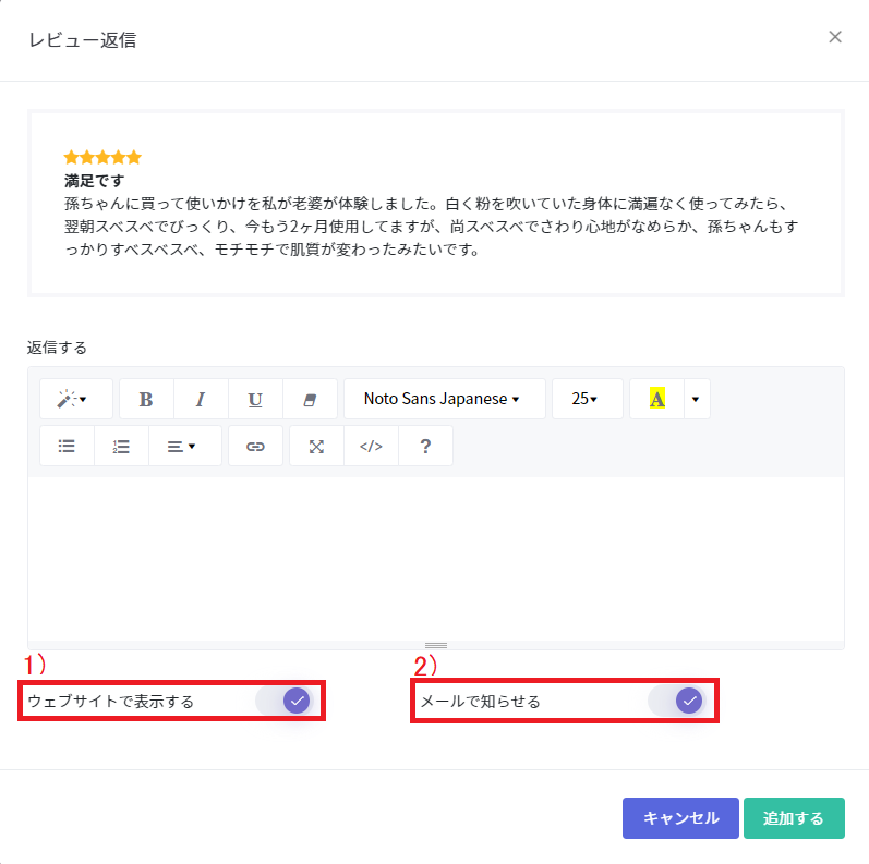 ※2 レビュー返信時は「メールで知らせる」機能がデフォルトで有効になっております。