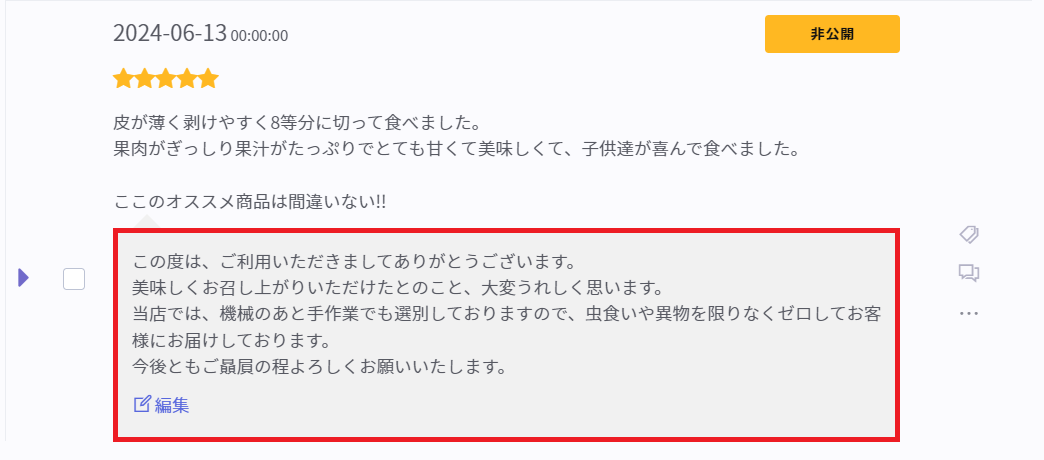 レビュー返信はこのように表示されます。