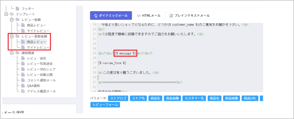 2)商品レビュー更新依頼とサイトレビュー更新依頼のメールテンプレートはメールテンプレートで編集できます。上記1で指定するメッセージは {% message %} の部分で表示されます。