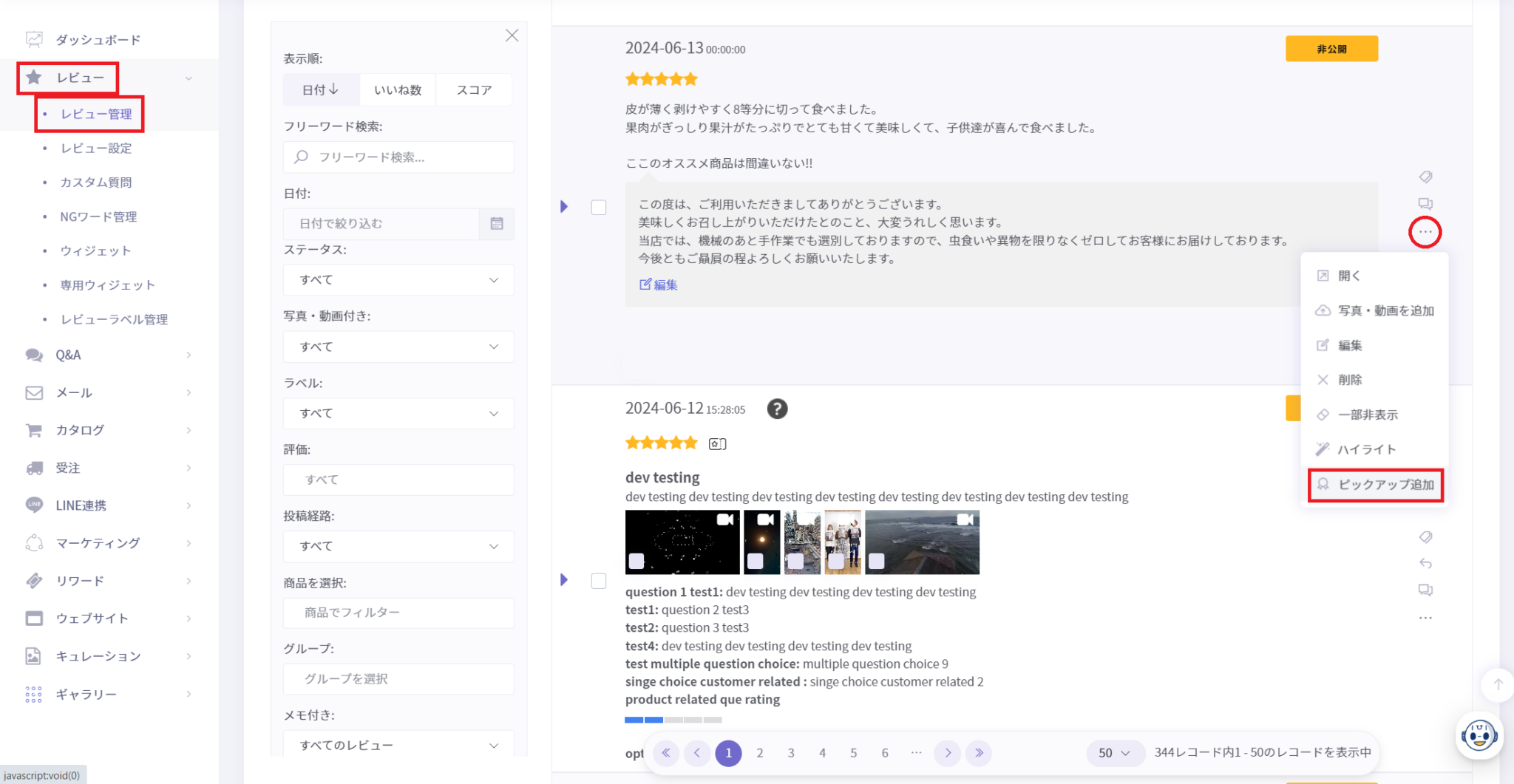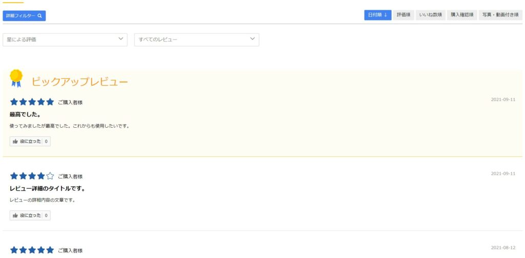 設定すると下写真のようにレビュー一覧の上部にピックアップレビューが表示されます。