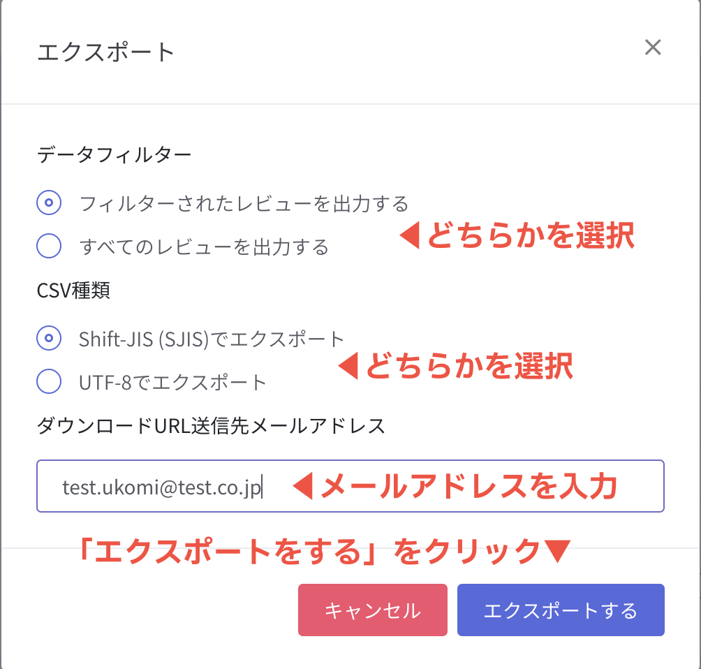 ②ファイル形式を選択してメールアドレスを入力し、「エクスポートする」をクリックします。