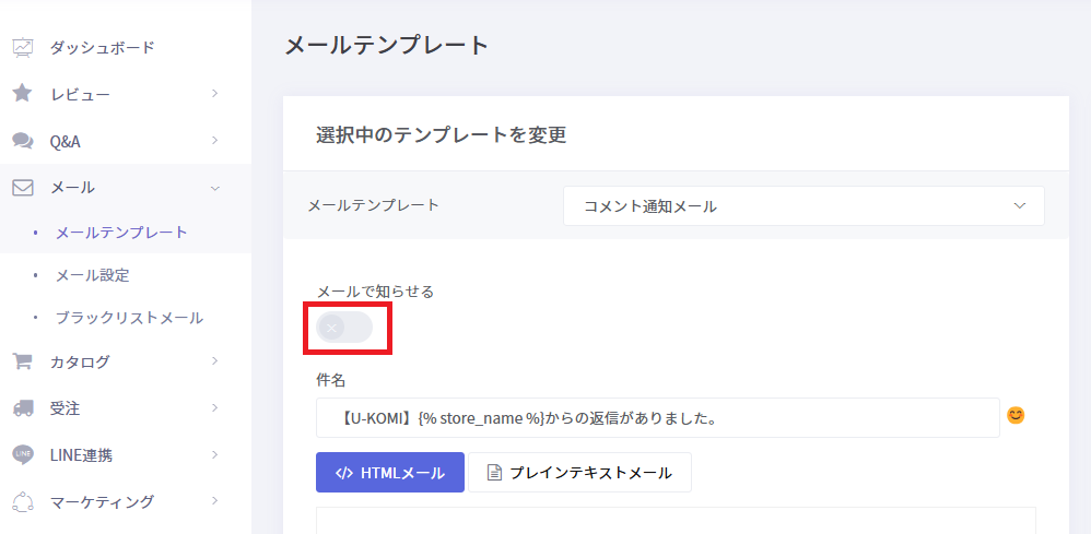メールテンプレートから「コメント通知メール」の「メールで知らせる」オプションを無効にすると、レビュー返信時の「メールで知らせる」機能がデフォルトで無効になります。