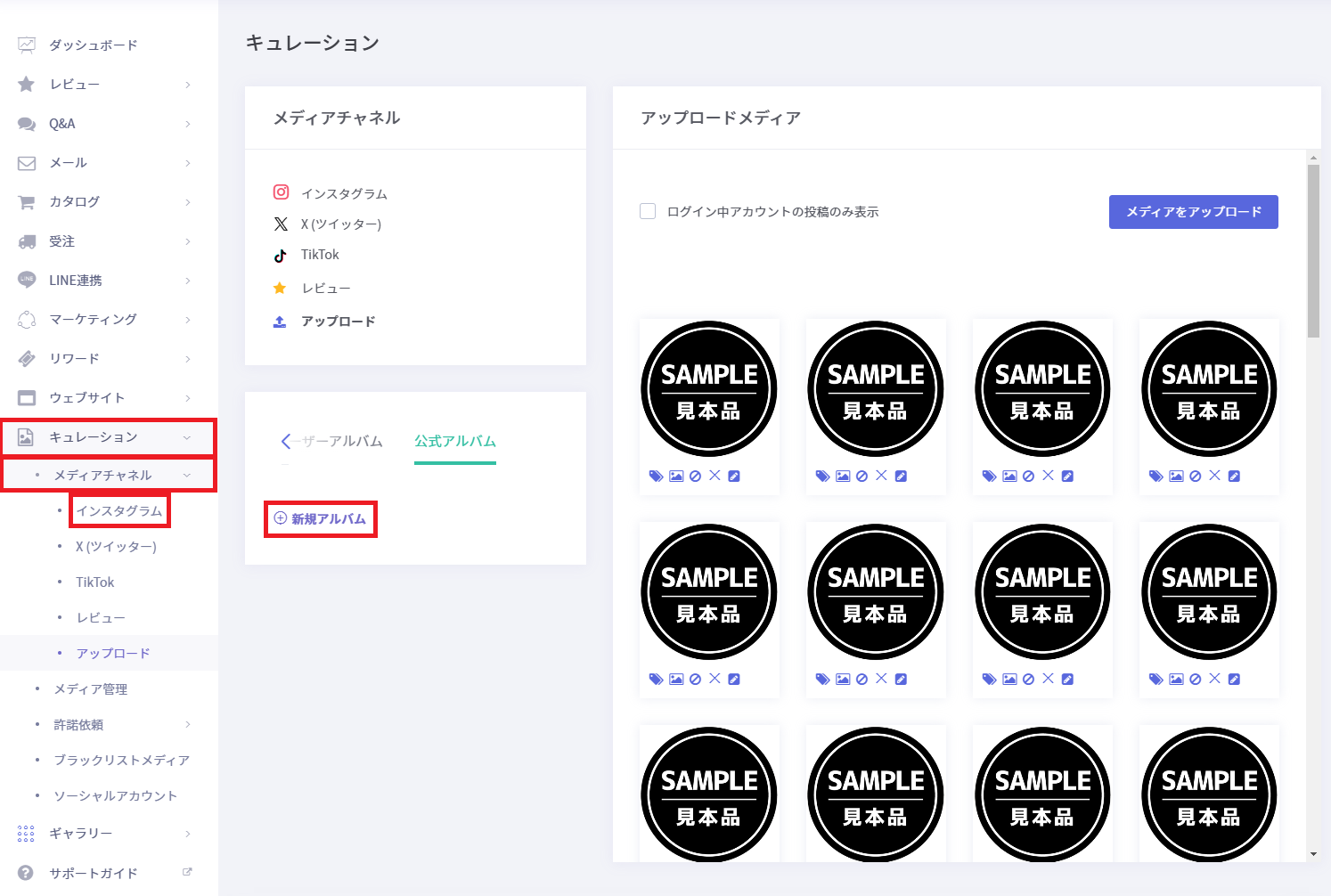 ☝ 管理画面左のメニューからキュレーション ➡ メディアチャネル ➡ インスタグラムをクリックします。