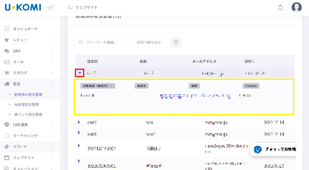 U-KOMI管理画面の受注→処理済み受注管理で 処理済みの受注データを管理できます。