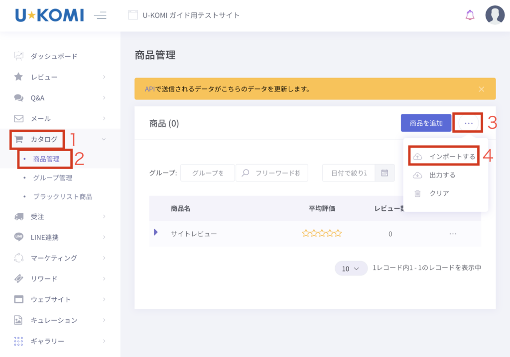 ①商品管理画面の画面右上にある「・・・」をクリックし【インポートする】をクリックします。