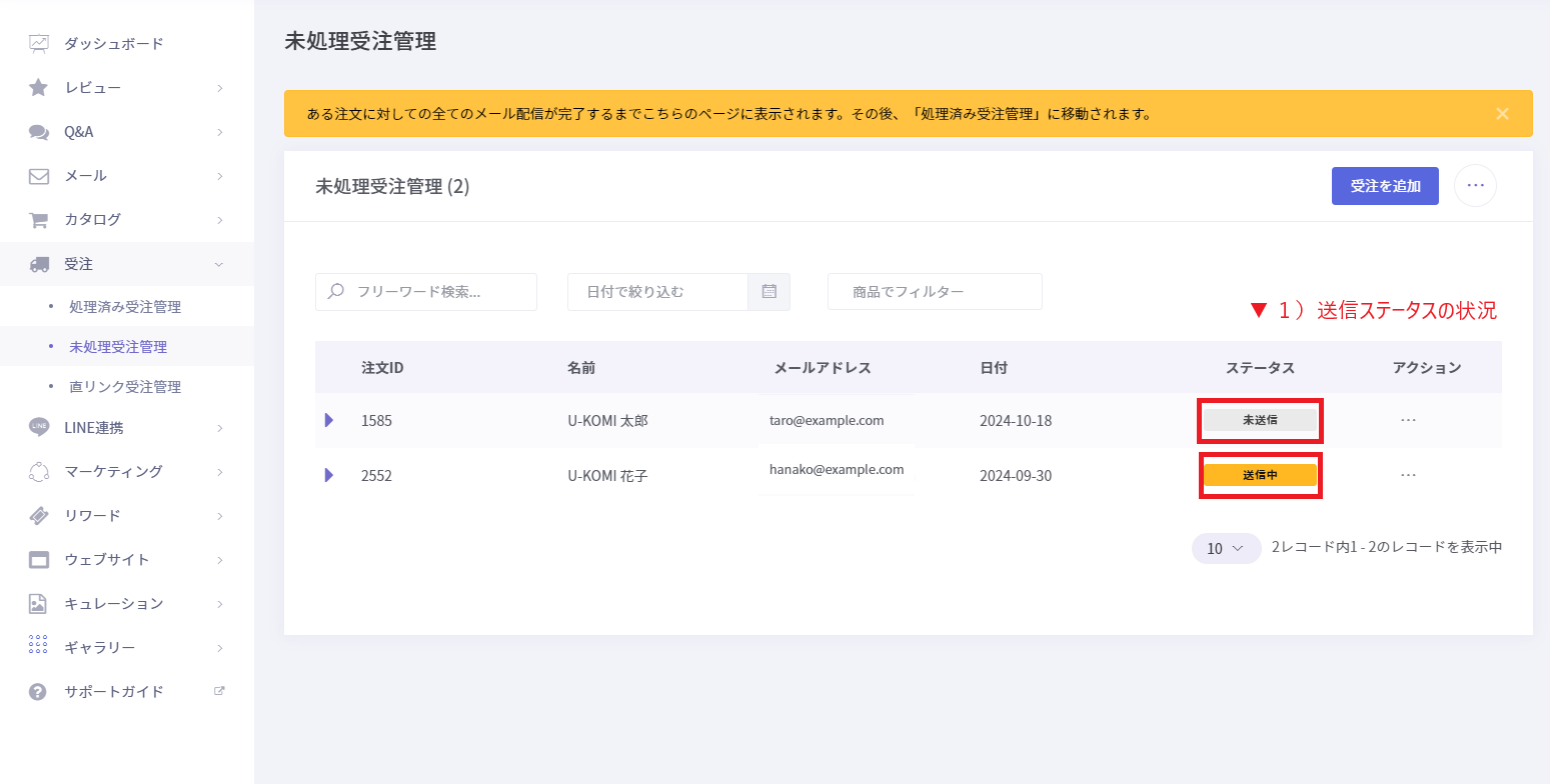 メール配信処理がすべて完了している受注に関しては、未処理受注管理一覧から表示されなくなります。
