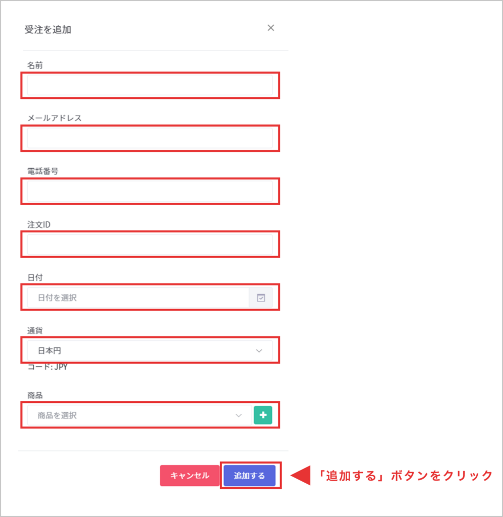 「受注を追加」ボタンをクリックすると受注データを追加することができます。