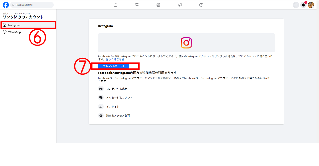 [アカウントをリンク]をクリックし、手順に従ってFacebookページとInstagramアカウントをリンクします。